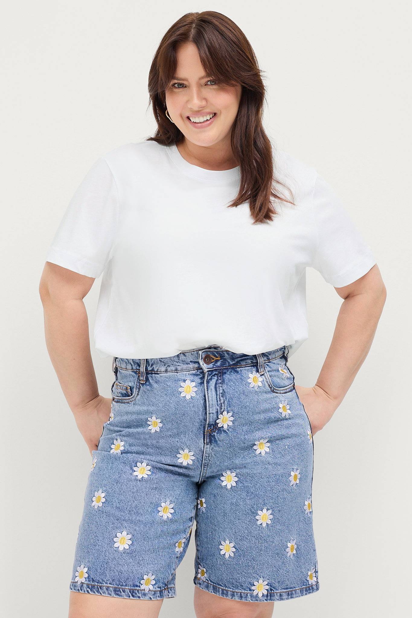 • Denimshorts i bomuldsdenim• Broderede blomster hele vejen rundt• Femlommemodel• Høj talje• Gylp med lynlås• Store størrelser