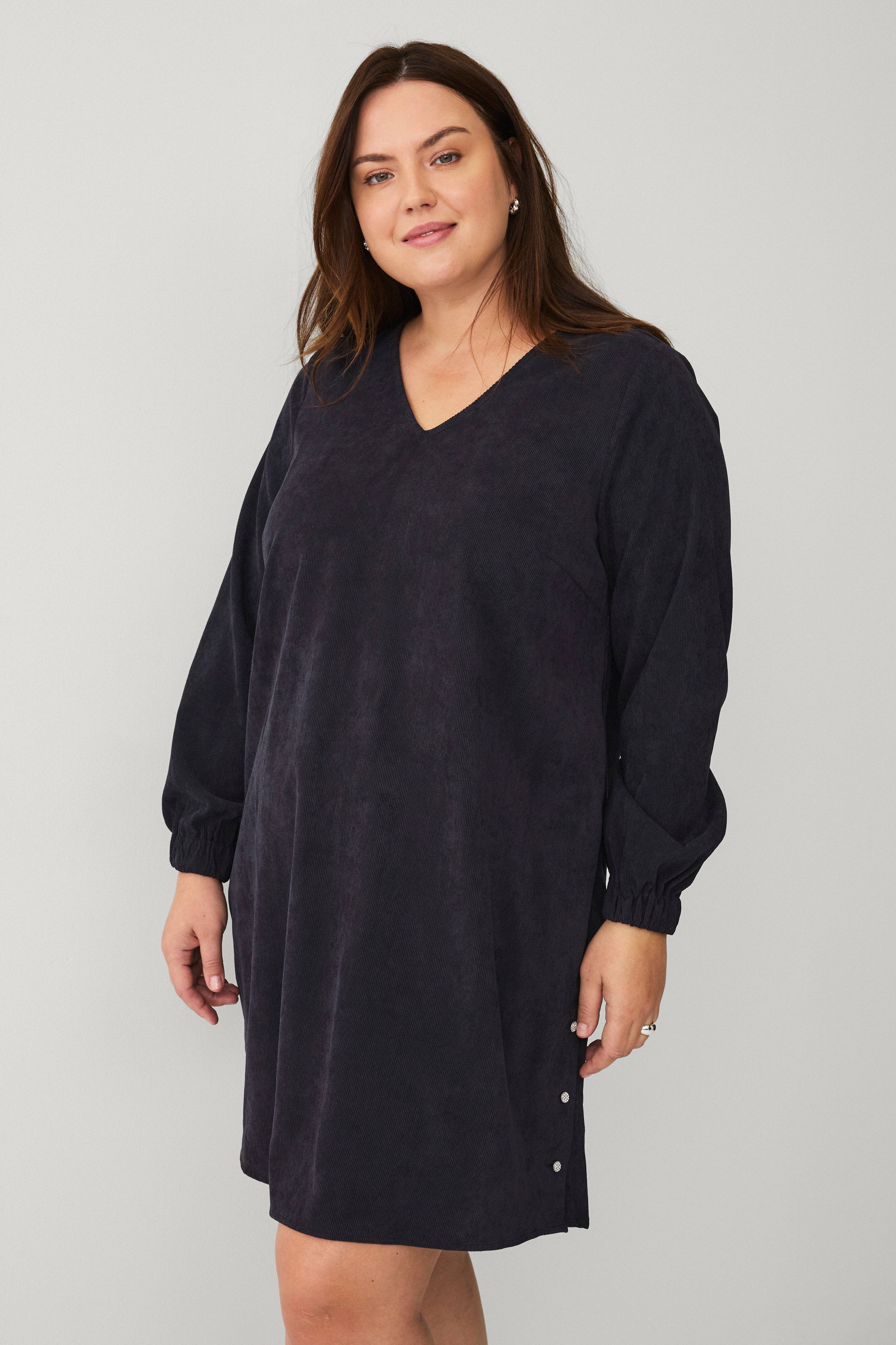 • Kort kjole i fløjl• V-formet halsudskæring• Lange ærmer med elastiske manchetter ved manchetterne• Knapper med rhinstene nede i siderne• Løs, bekvem pasform• Store størrelser• Længde: 98 cm i størrelse S