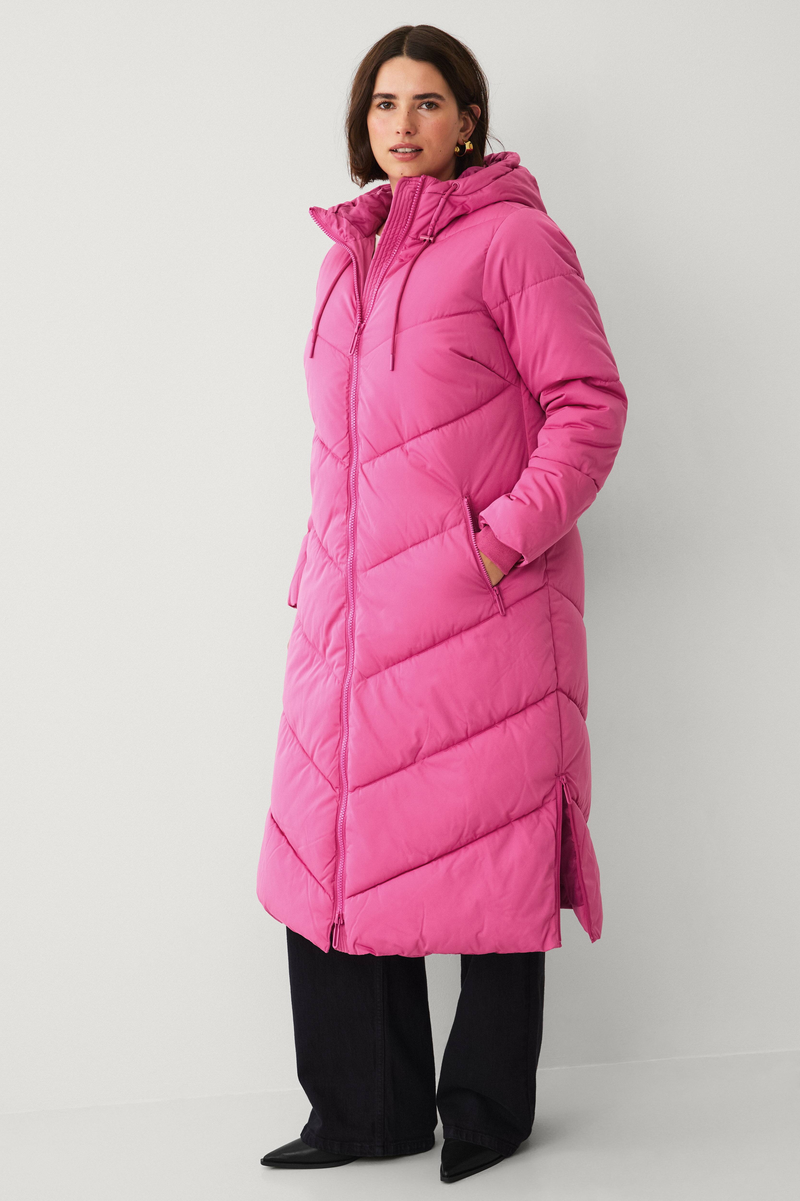 • Lang, quiltet, foret pufferfrakke• Fast hætte med træksnørre• To-vejs lynlås• To lommer med lynlås• En inderlomme med lynlås• Ribmanchetter ved manchetterne• Slidser med lynlåse nede i siderne• Længde: 117 cm i størrelse S