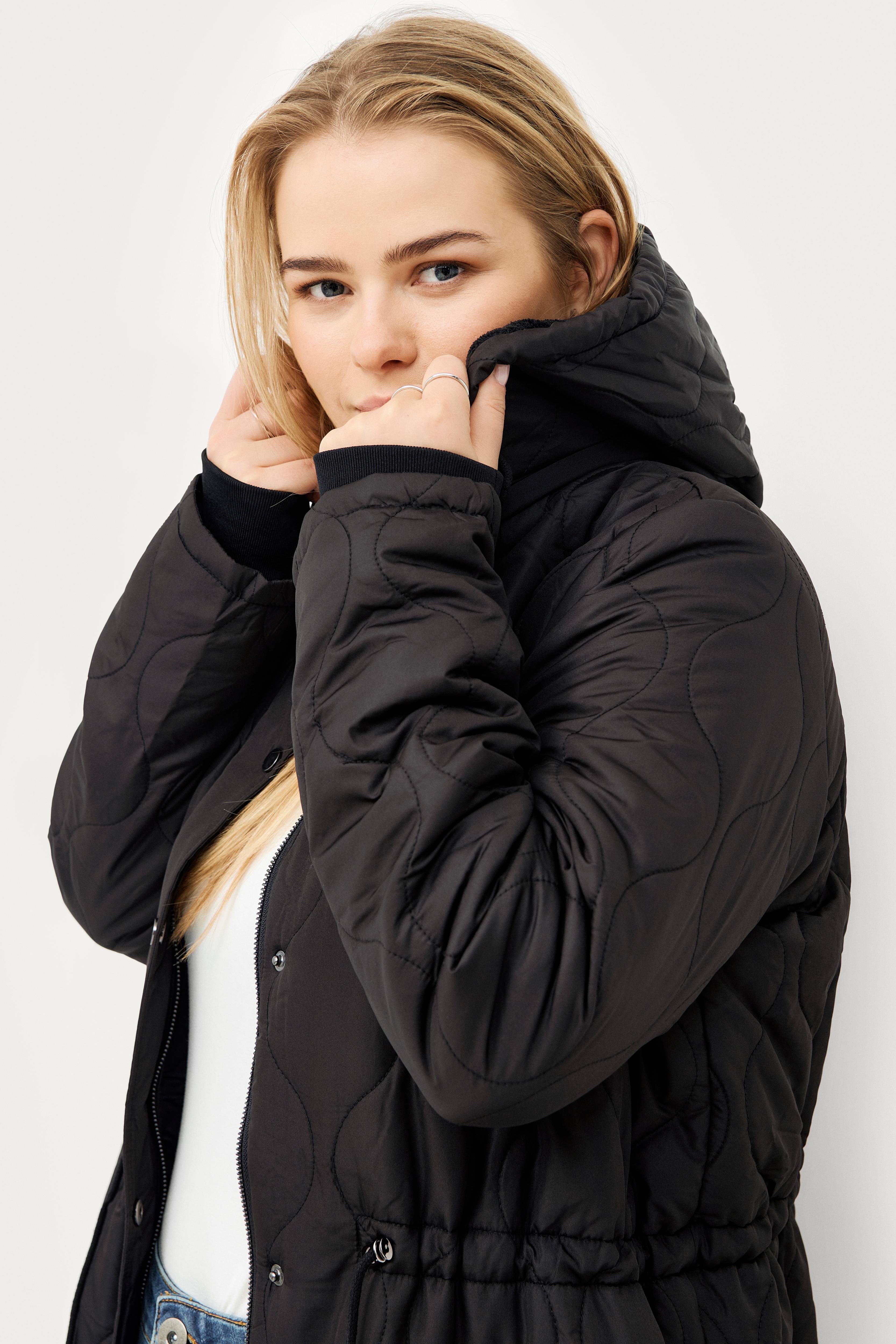 • Store størrelser• Quiltet frakke med polstring• Blødt fleece for• Aftagelig hætte• To-vejs lynlås foran• Vindflap med trykknapper• Træksnørre ved taljen• To lommer• Længde: 93 cm i størrelse S
