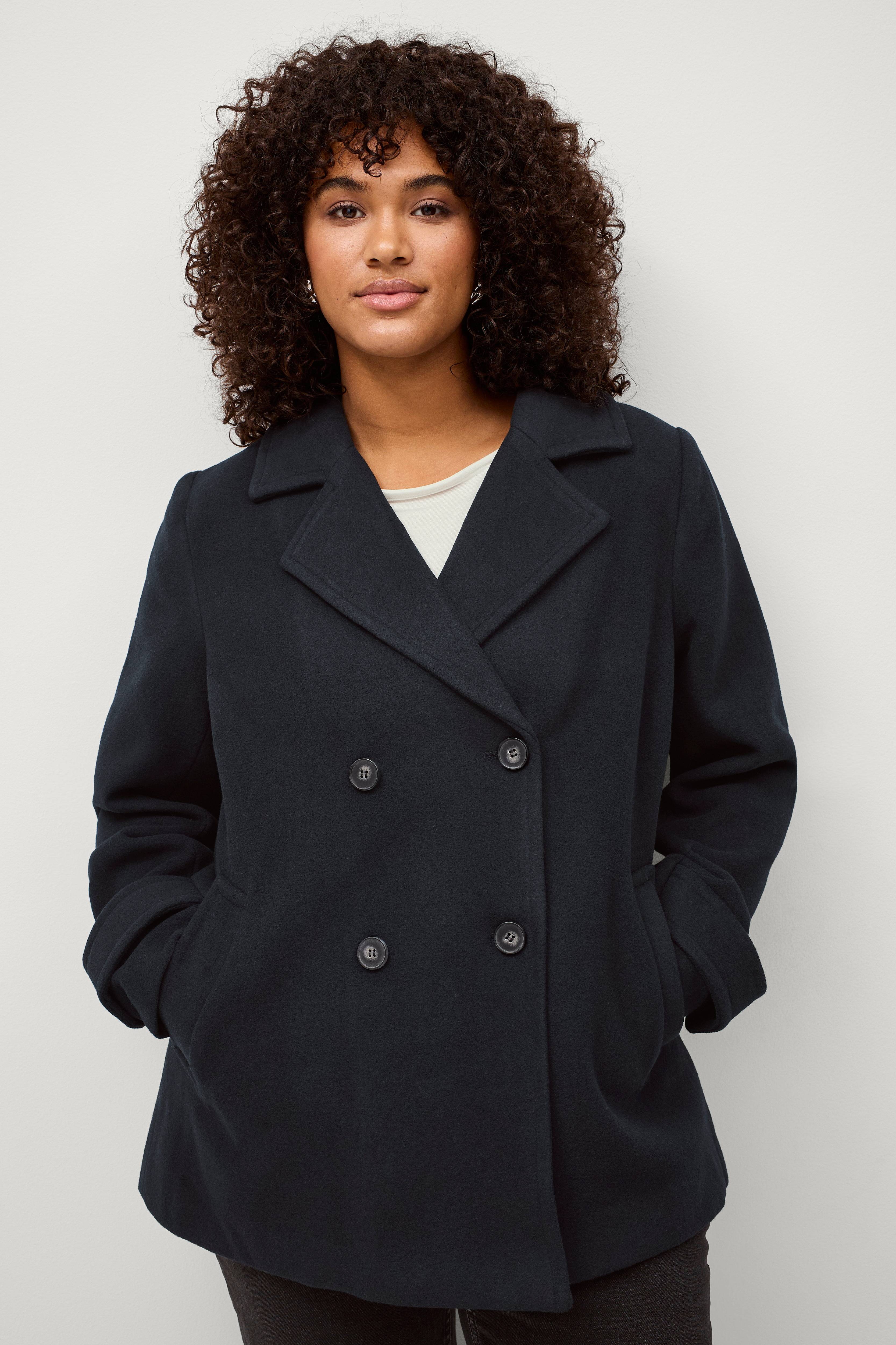 • Kort frakke i uldblanding• Dobbelte knaprækker• To lommer• Knapdetaljer ved manchetterne• Store størrelser• Længde: 75 cm i størrelse S