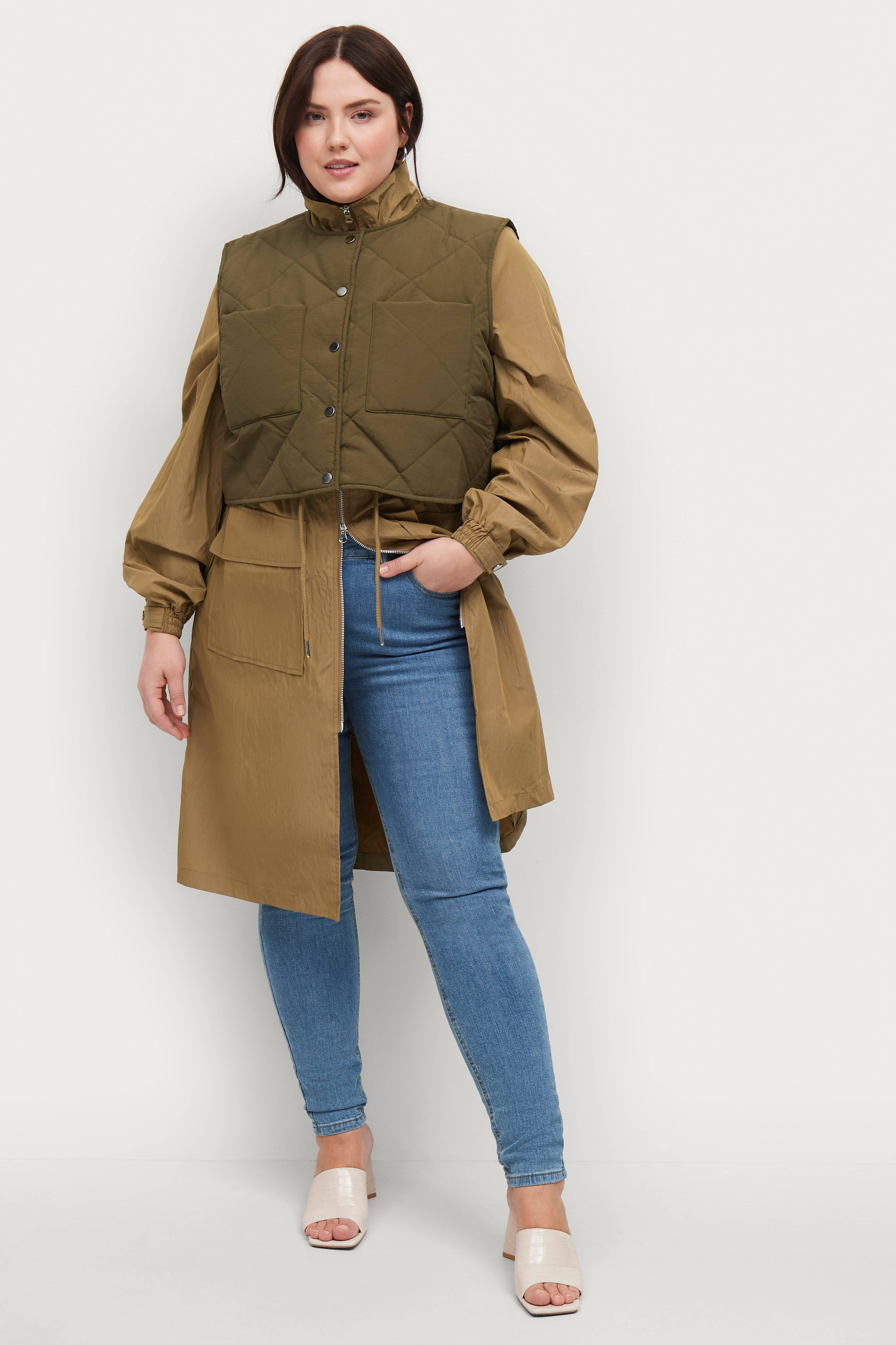 Lang, tynd frakke med 2-vejslynlås foran og to lommer. Justerbar løbegang i taljen samt to store lommer. Aftagelig vest i quiltet, lidt kortere model med tynd vattering. Trykknapper og to lommer foran. Længde frakke 112 cm i str. S.