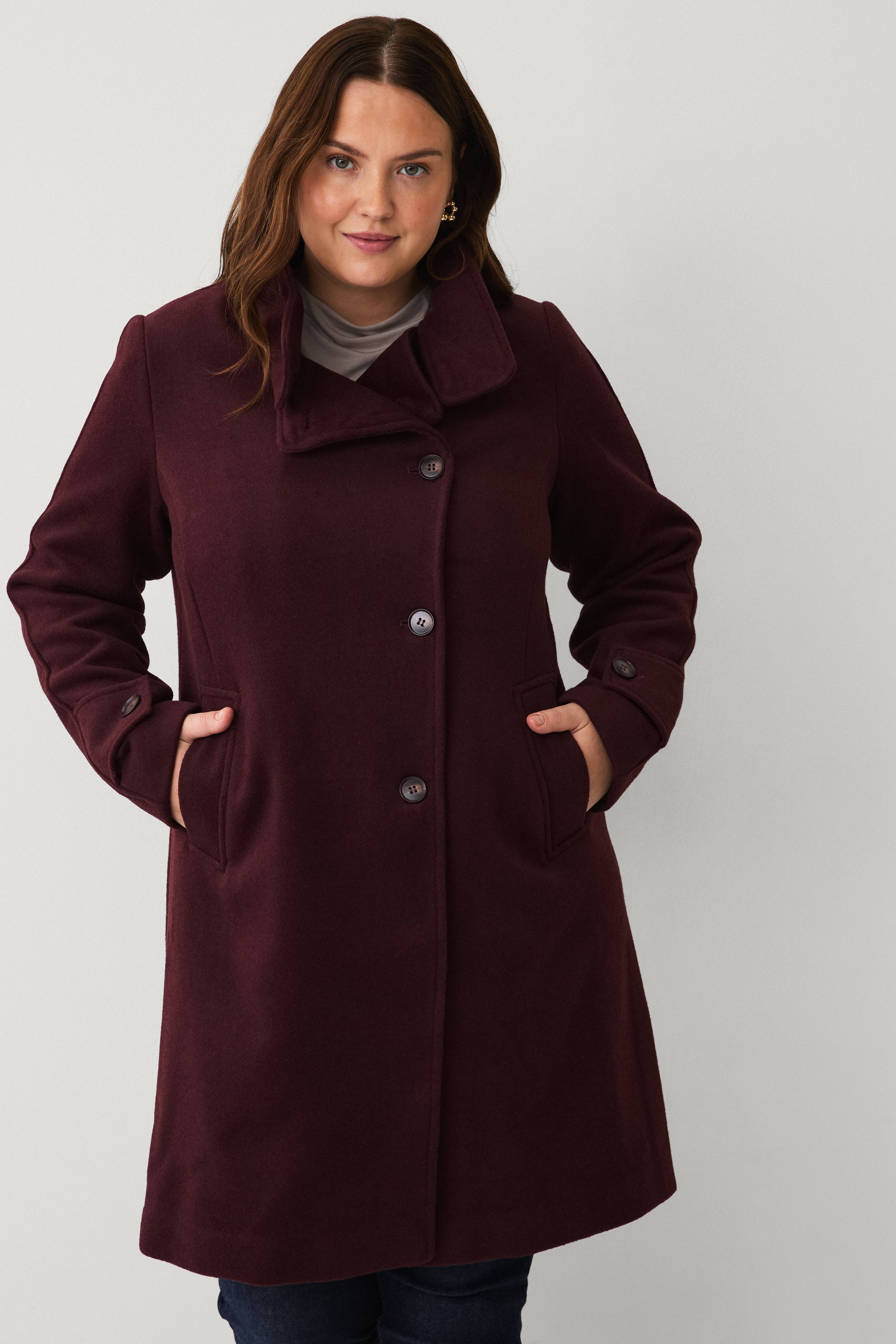 • Frakke i uldblanding• Høj krave• Stropper ved ærmeafslutningerne• Knaplukning• Tekstilforing• Sidelommer• Plusstørrelser• Længde: 98 cm i størrelse S