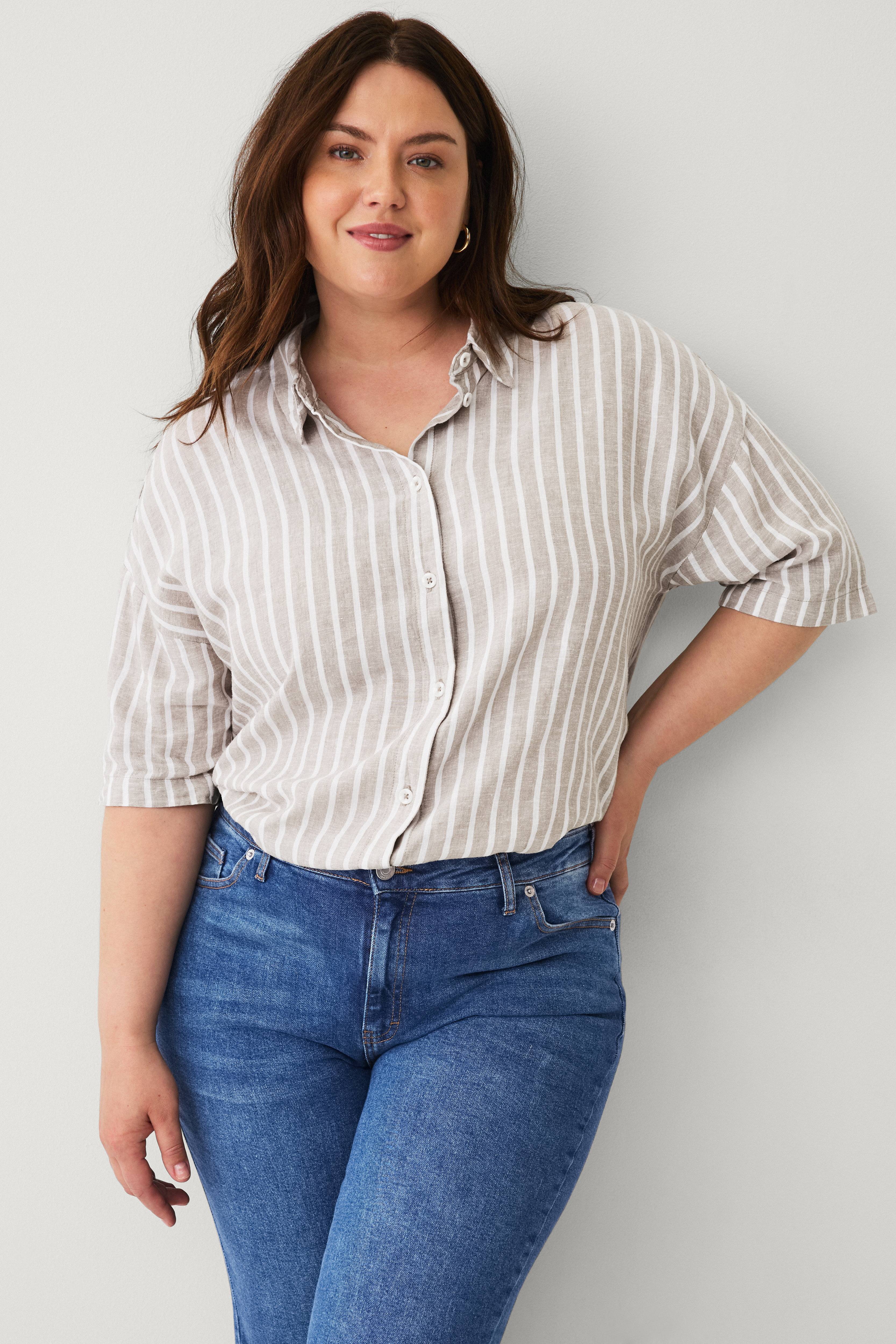 • Hørskjorte med nedsænkede skuldre og halvlange ærmer• Knapper foran• Afrundet søm• Store størrelser