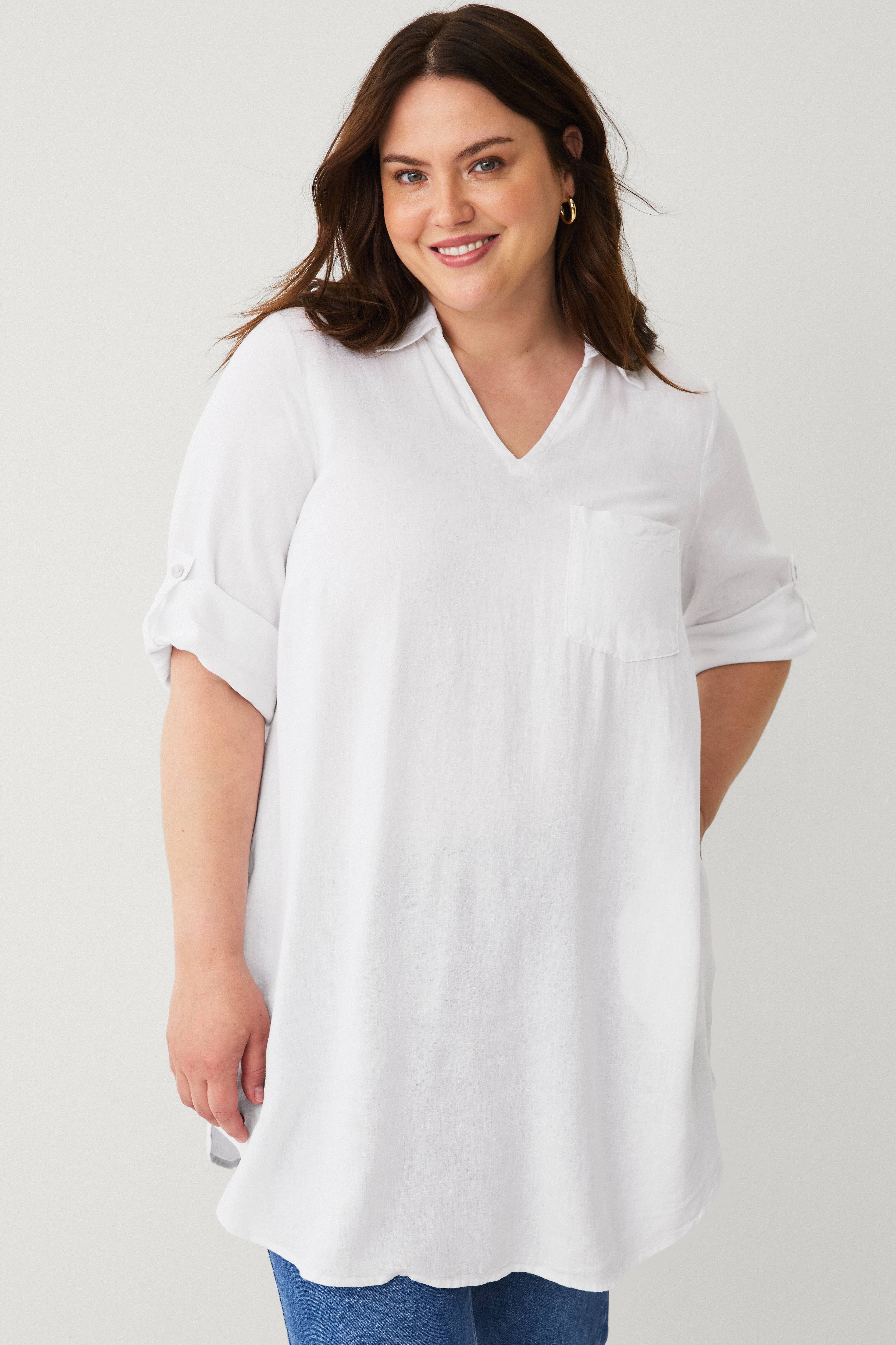 • Hørtunika med halvlange, opfoldende ærmer med en knap• V-formet halsudskæring med krave• Brystlomme• Afrundet søm• Store størrelser• Længde: 90 cm i størrelse S