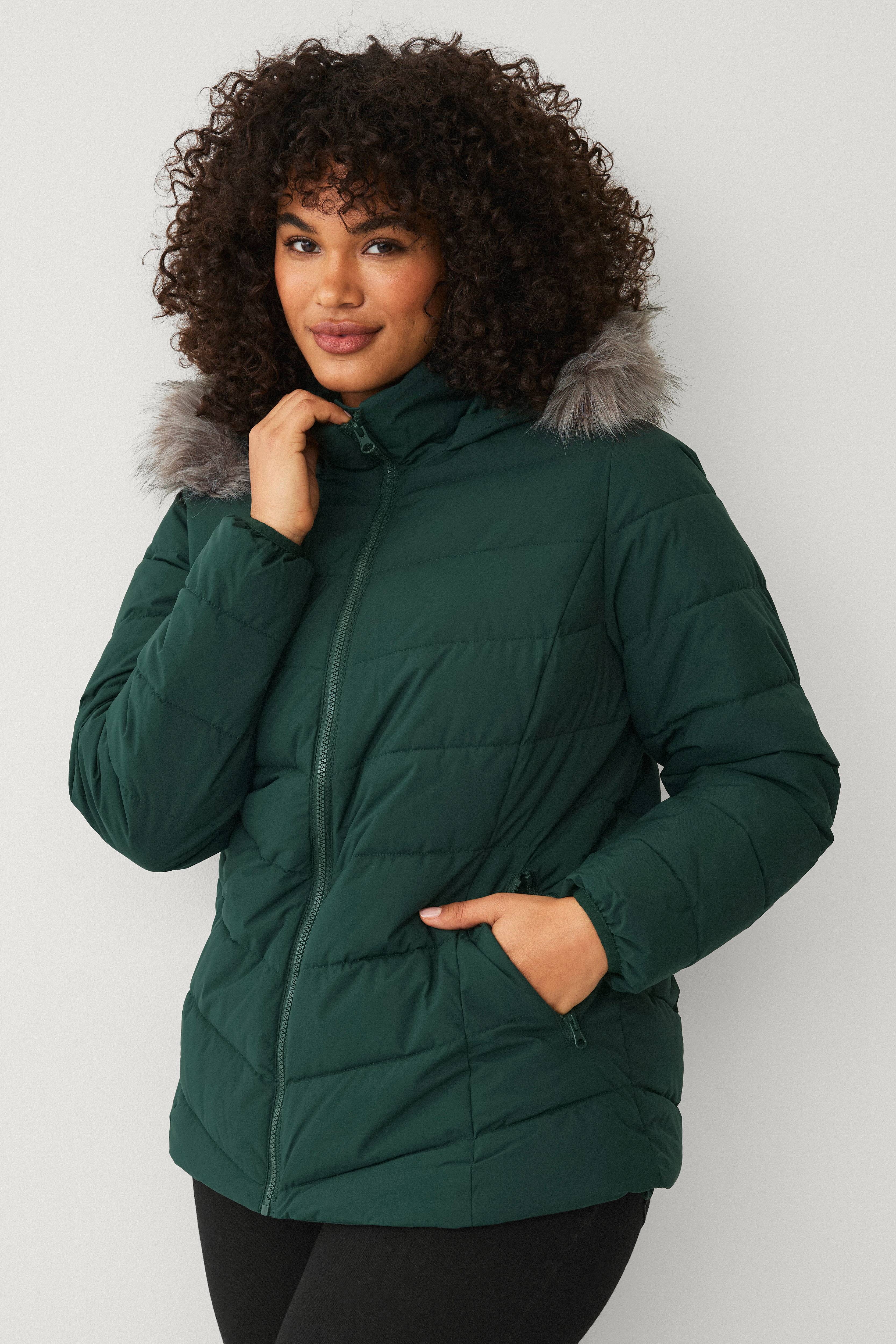 • Quiltet, foret pufferjakke • Fast hætte med aftagelig kunstpelskant • Lynlås • To lommer med lynlås • Elastik ved manchetterne • Store størrelser • Længde: 72 cm i størrelse S