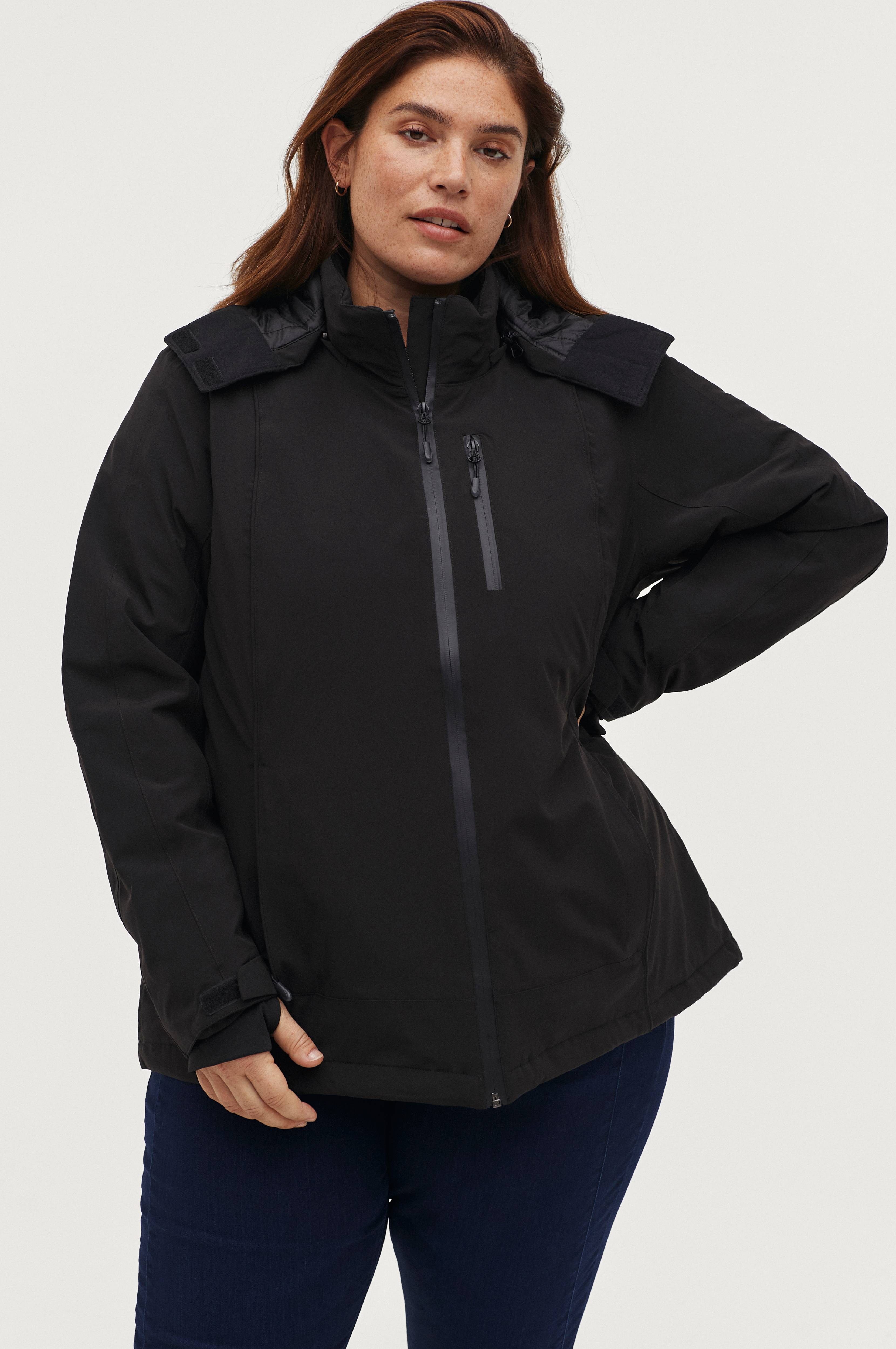 Vatteret funktionsjakke i kort, smidig model. I vandtæt stof med åndbarhed og tapede sømme. Lynlås og skjulte lommer med lynlås foran. Aftagelig hætte med løbegang. Ribkant i jersey og justerbar velcrorem i ærmekant. Snefang og løbegang i kanten forneden. Længde ca. 65 cm i str. S.