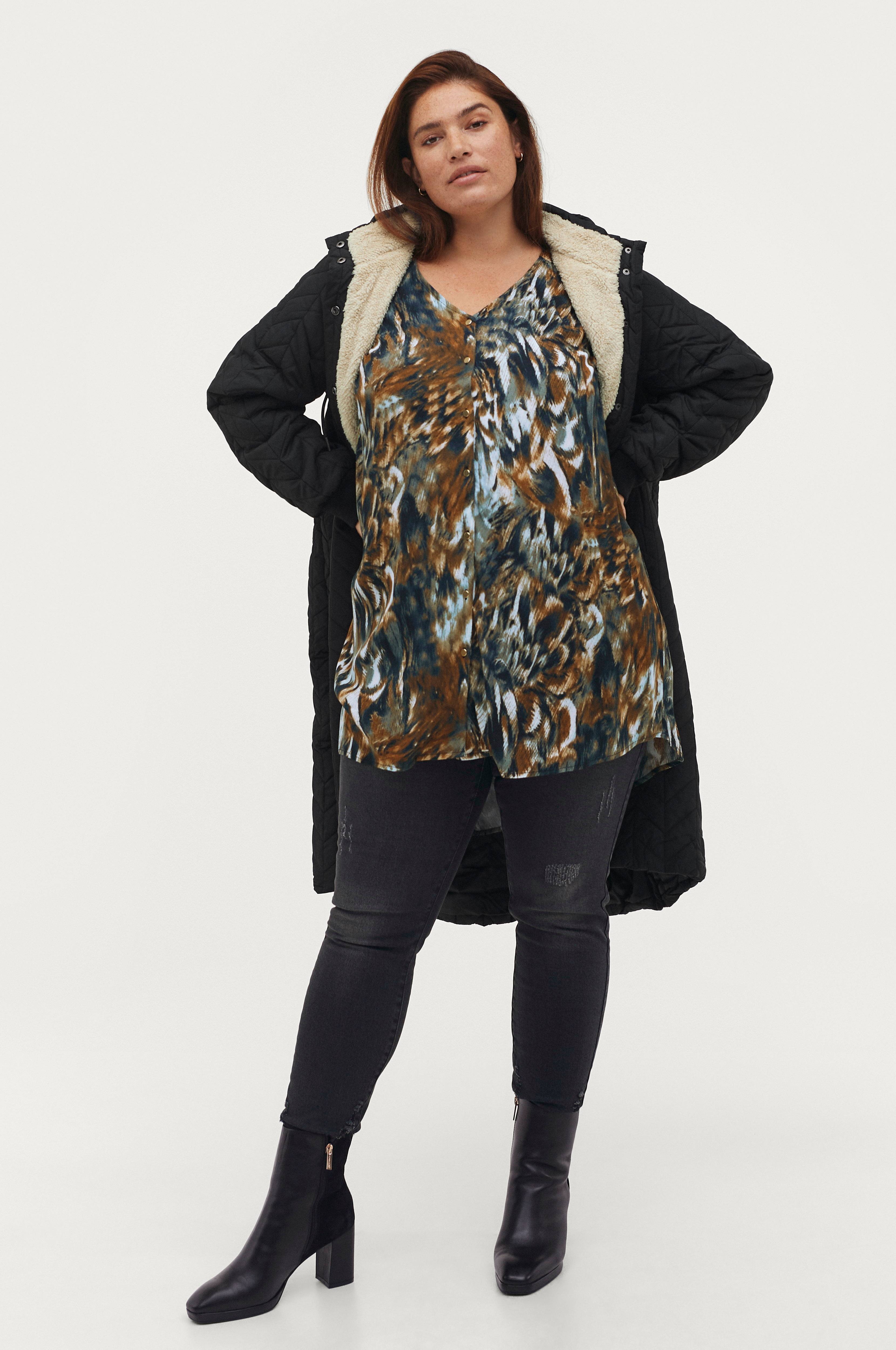 • Quiltet, let foret jakke• Teddyforing i hætten og på toppen• Hætte med træksnørre• Trykknapper• To lommer med trykknap• Ribmanchetter ved manchetterne• Slidser med trykknapper nede i siderne• Længde: 105 cm i størrelse S