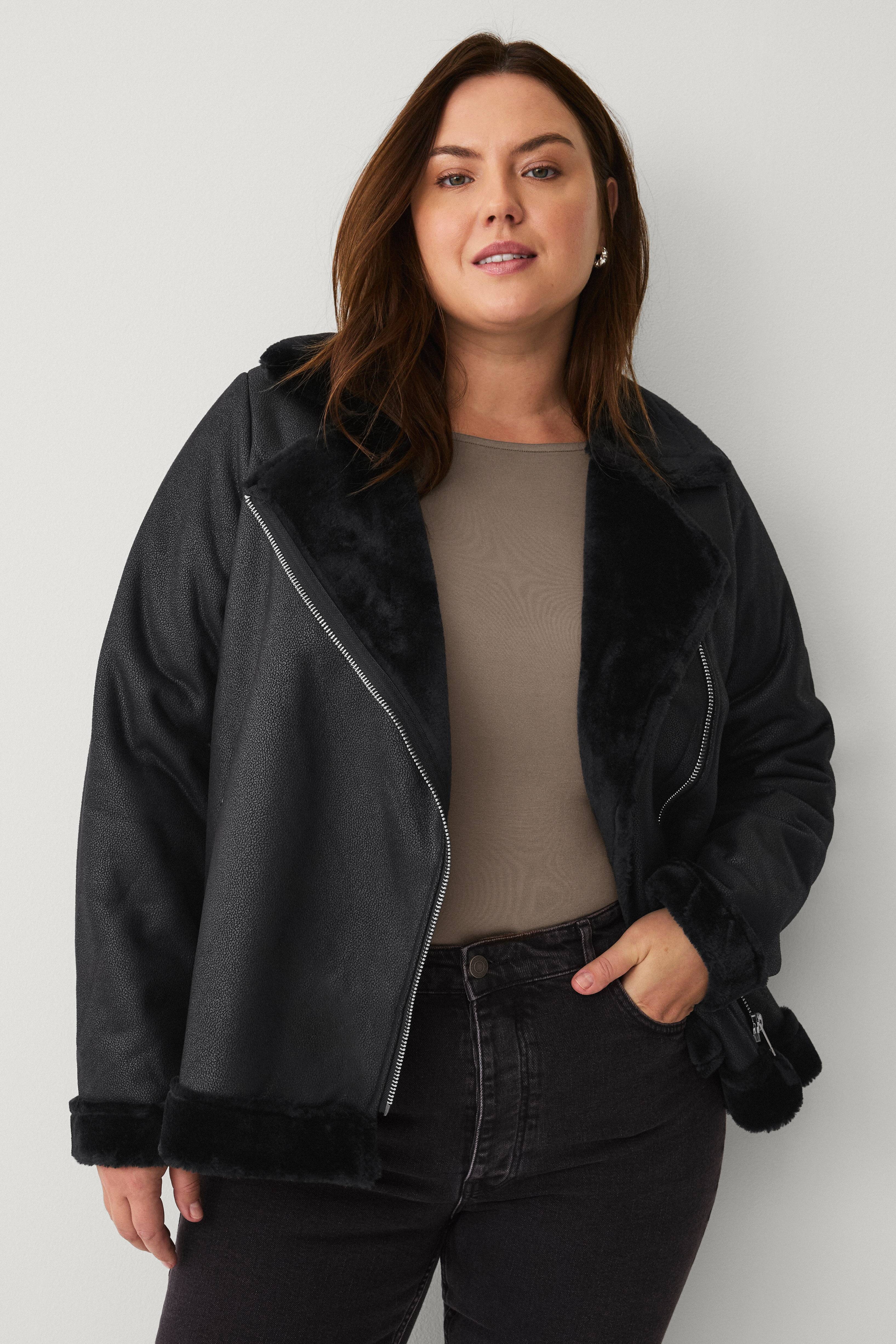 • Pilotjakke i imiteret læder med for i kunstskind• Asymmetrisk lynlås• Detaljer i kunstskind på kraven, ved ærmeafslutningerne og ved nederste kant• Tre lommer med lynlås• Store størrelser• Længde: 70 cm i størrelse S
