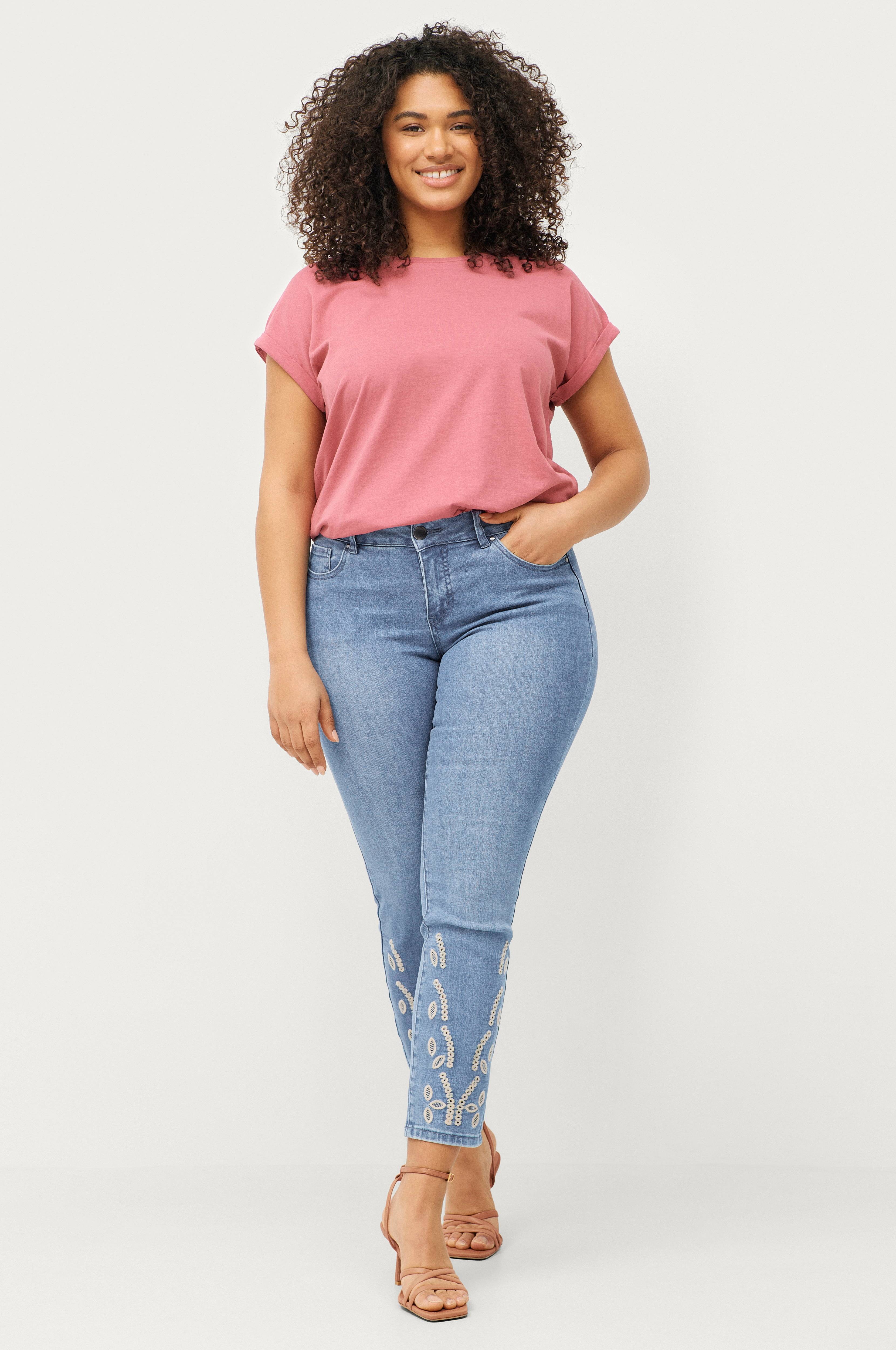 • Smalle jeans med broderi ved enden af benene• Fem lommer• Gylp med lynlås• Strækkvalitet• Store størrelser