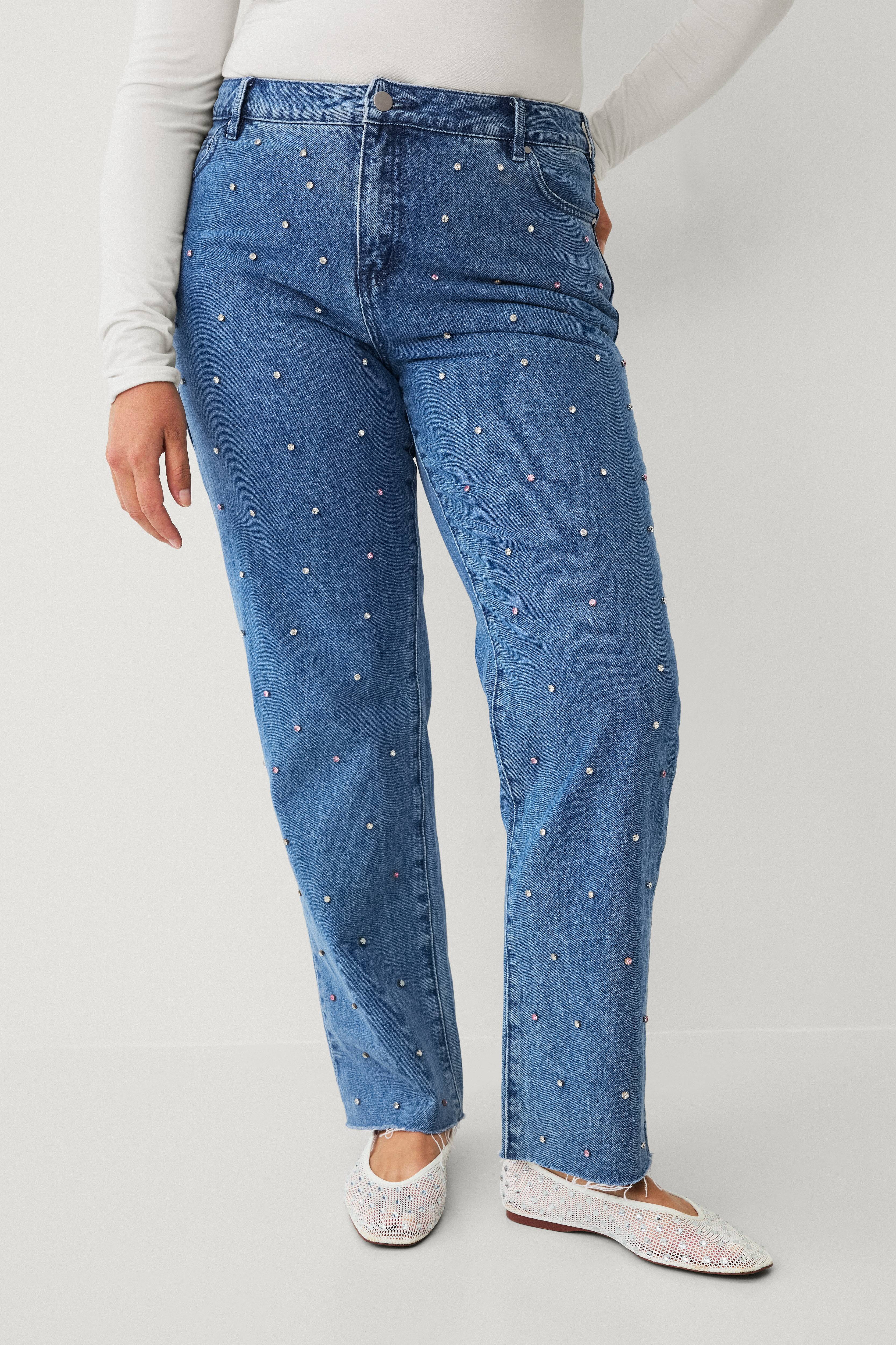 • Høj talje• Glitrende rhinstene ved fronten• Femlommemodel• Gylp med lynlås• Normal pasform med lige ben• Store størrelser