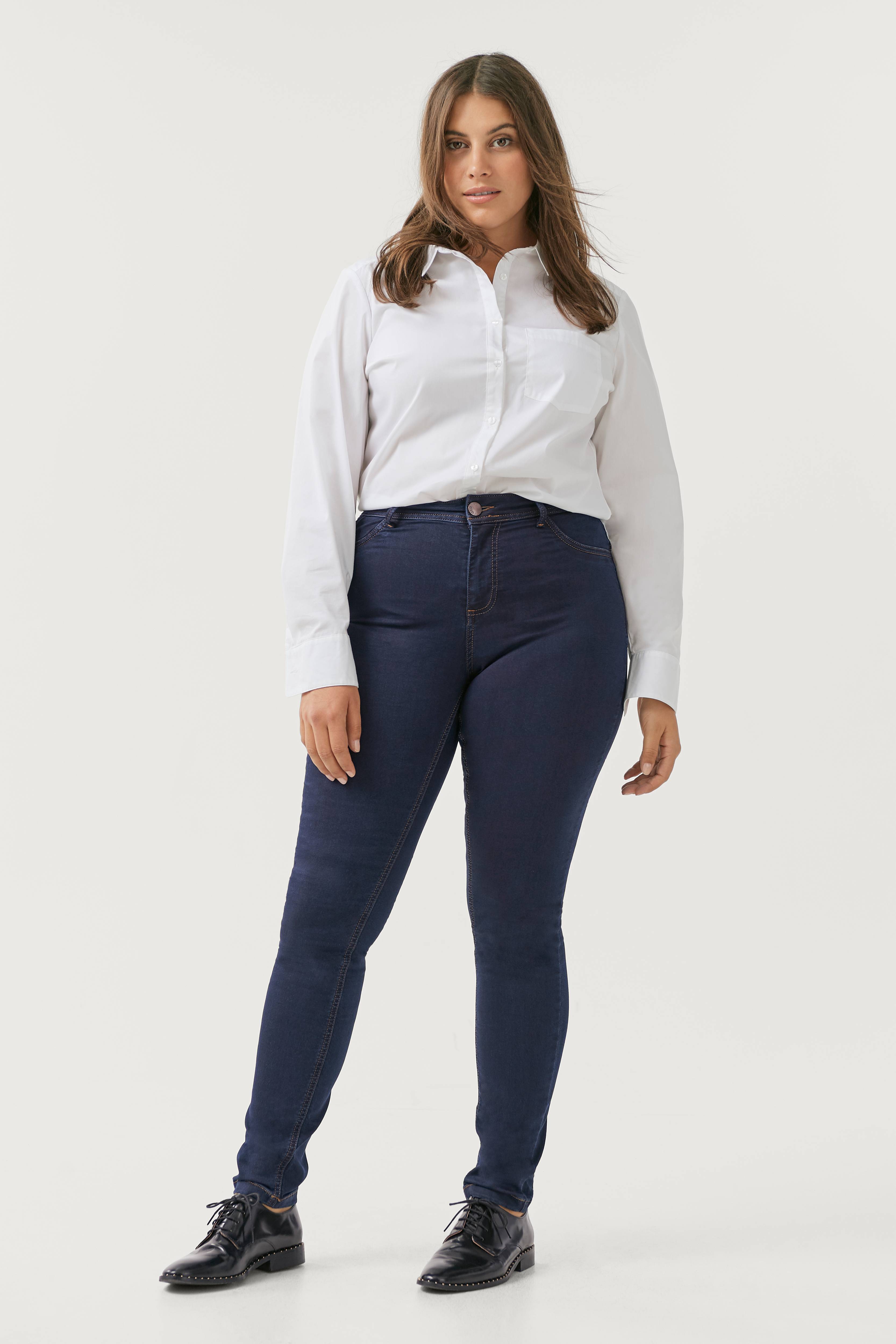 Jeans Nille Ekstra Slim fra Zizzi i skøn model med høj talje, kurvet hofte og ekstra smalle ben. To pyntestukne forlommer og en lille lomme samt to påsyede baglommer.