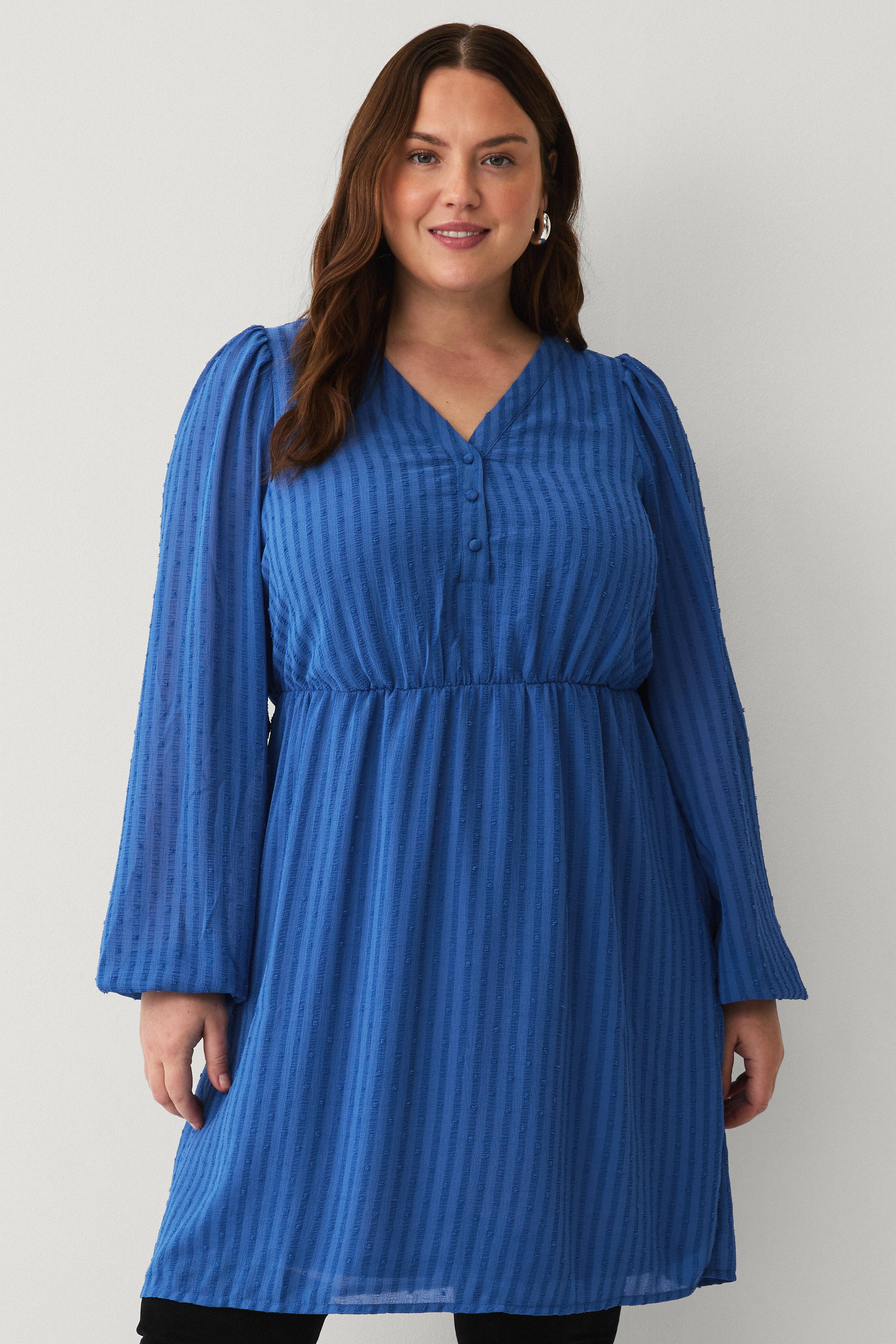 • Tynd kjole med struktur• V-formet halsudskæring med kort knaplukning foran• Defineret, elastisk talje• Lange, semitransparente ærmer med elastik ved manchetterne• Foret• Længde: 94 cm i størrelse S• Plusstørrelser