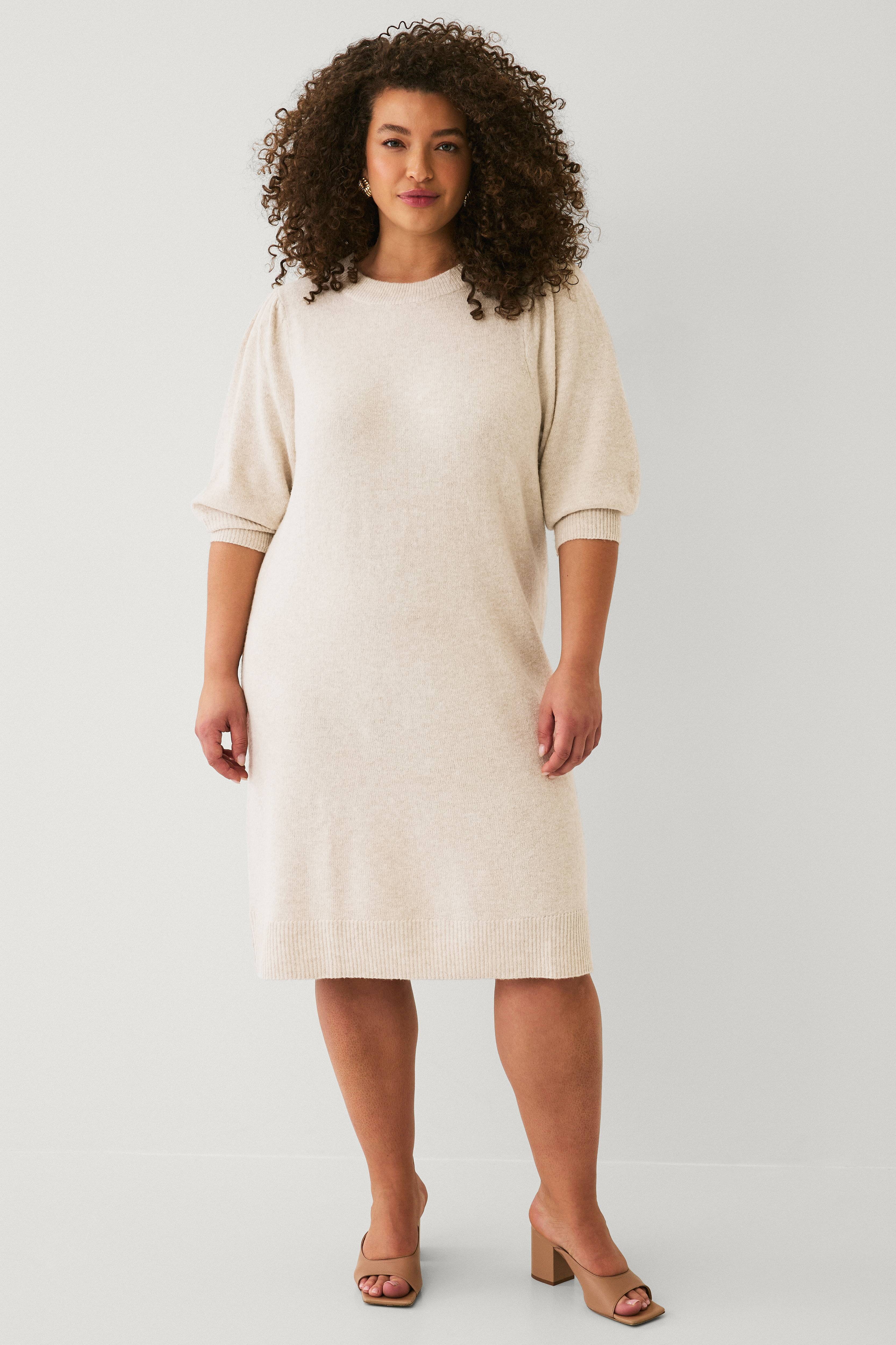 • Strikket kjole• Rund halsudskæring• 3/4 lange ærmer med ribmanchetter• Ribstrikket søm• Store størrelser• Længde: 98 cm i størrelse S