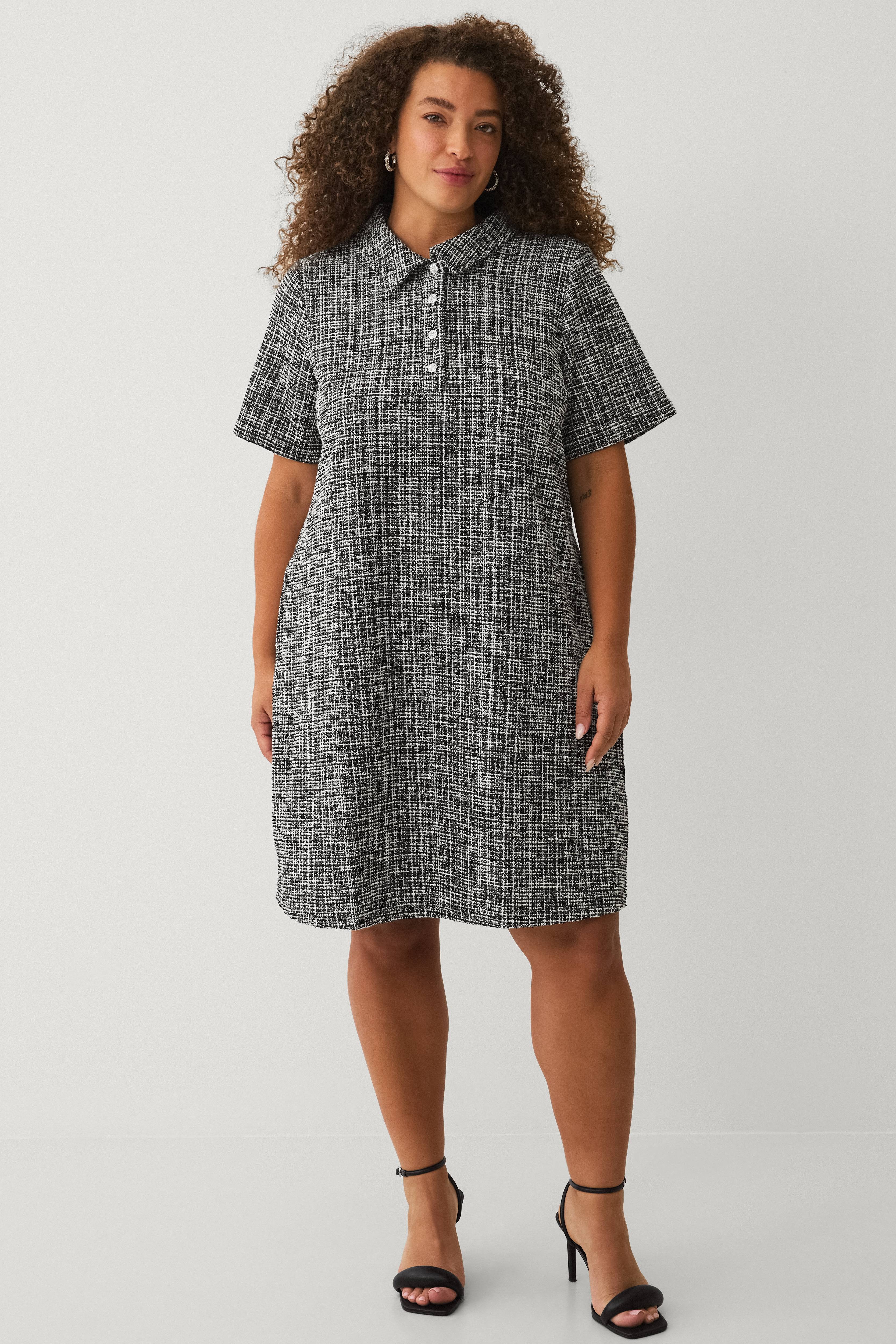• Kortærmet kjole i tweed• Krave• Kort knaplukning foran med dekorative, funklende knapper• Tekstilforing• Sidelommer• Model med svaj• Længde: 95 cm i størrelse 42/44• Plusstørrelser
