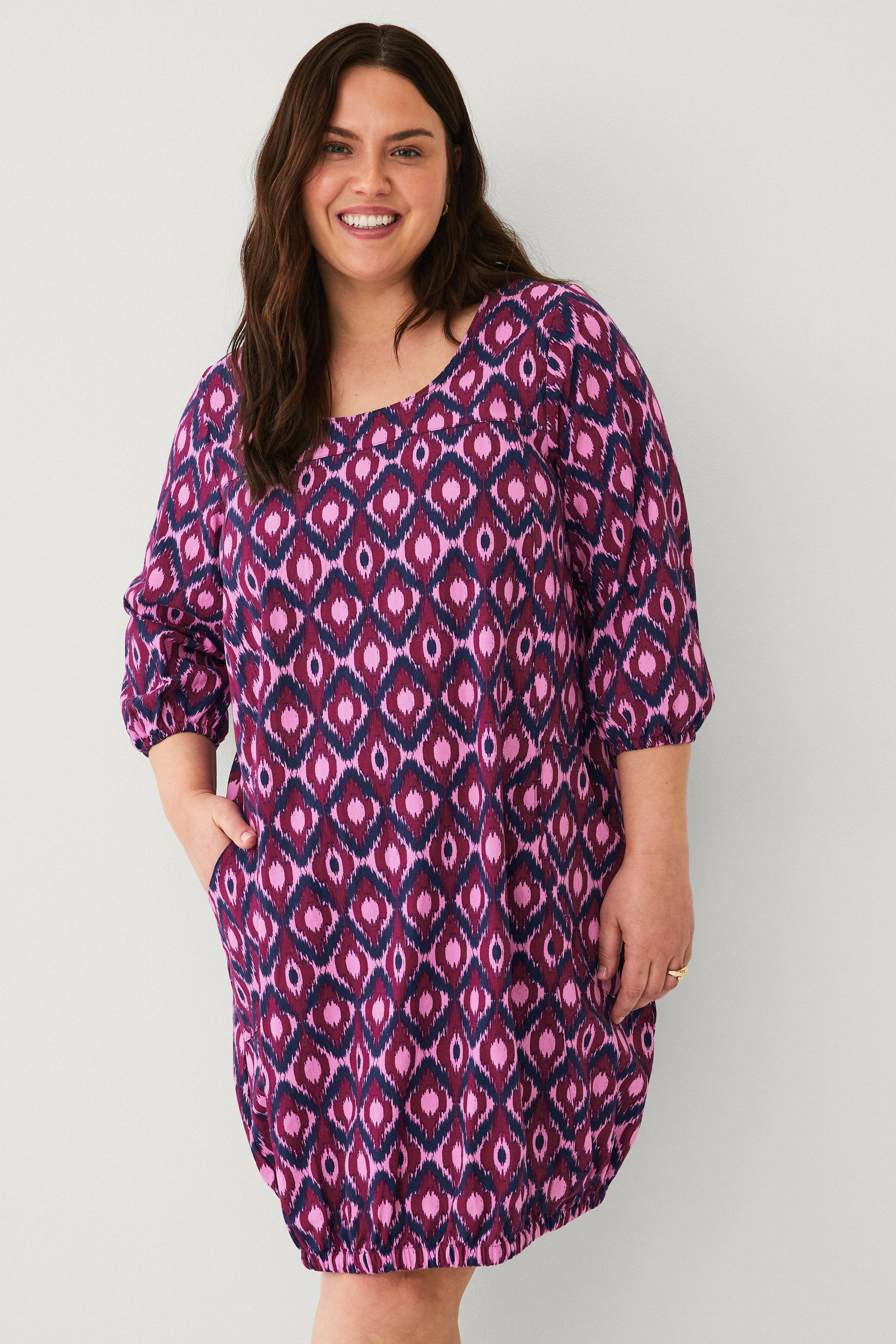 • Kjole i bomuld med løs pasform• Rund halsudskæring• 3/4 lange ærmer• Sidelommer• Ballonformet silhuet med elastik ved nederste kant• Store størrelser• Længde: 100 cm i størrelse S