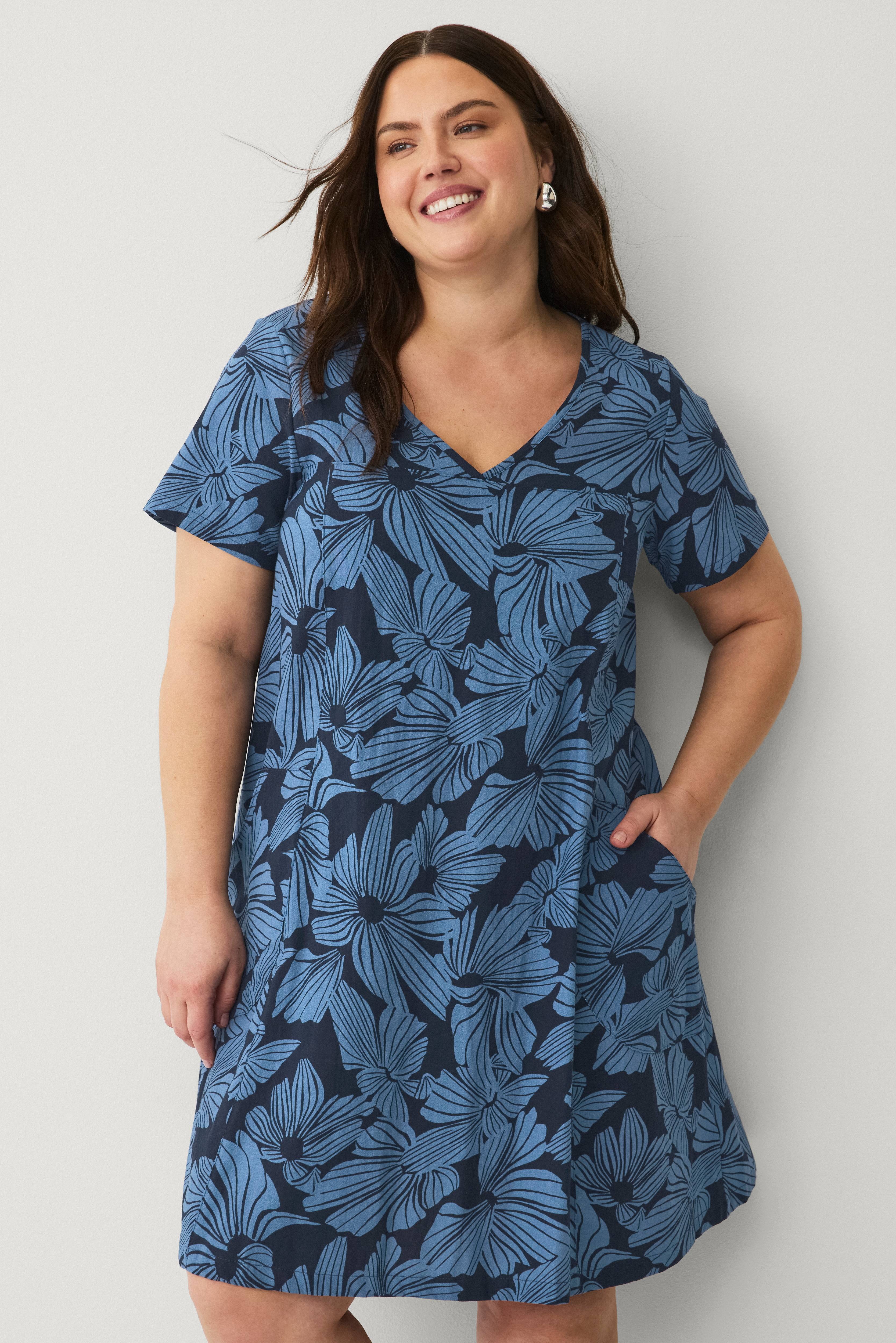 • Kjole i bomuld med printet mønster• Løst A-linje design• V-formet halsudskæring• To lommer• Store størrelser• Længde: 98 cm i størrelse 42/44
