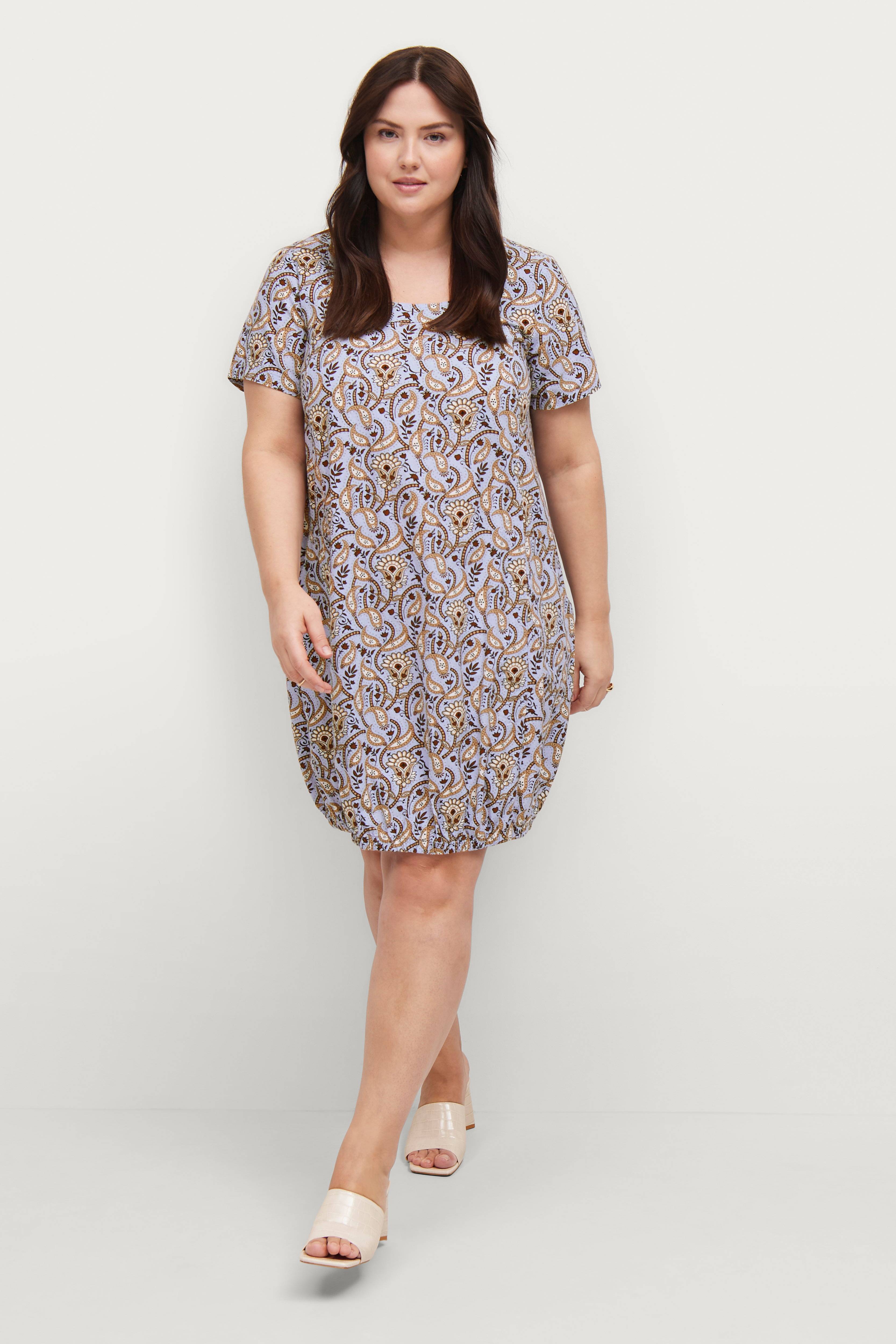 Kortærmet kjole i vævet bomuldskvalitet med mønster. Lommer foran og elastisk kant forneden. Længde ca. 95 cm i str. S.