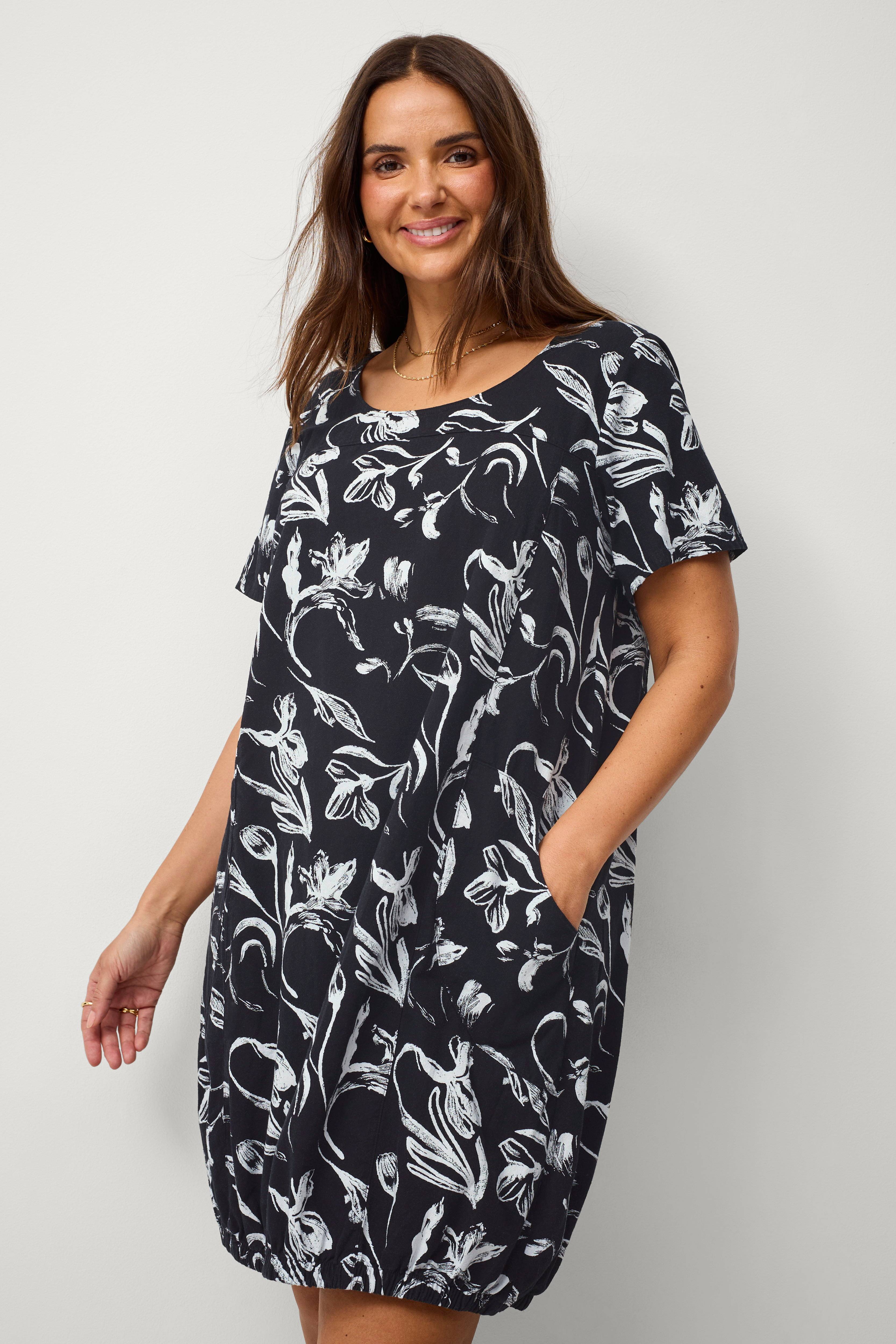 Kortærmet kjole i vævet bomuldskvalitet med mønster. Lommer foran og elastisk kant forneden. Længde ca. 95 cm i str. S.