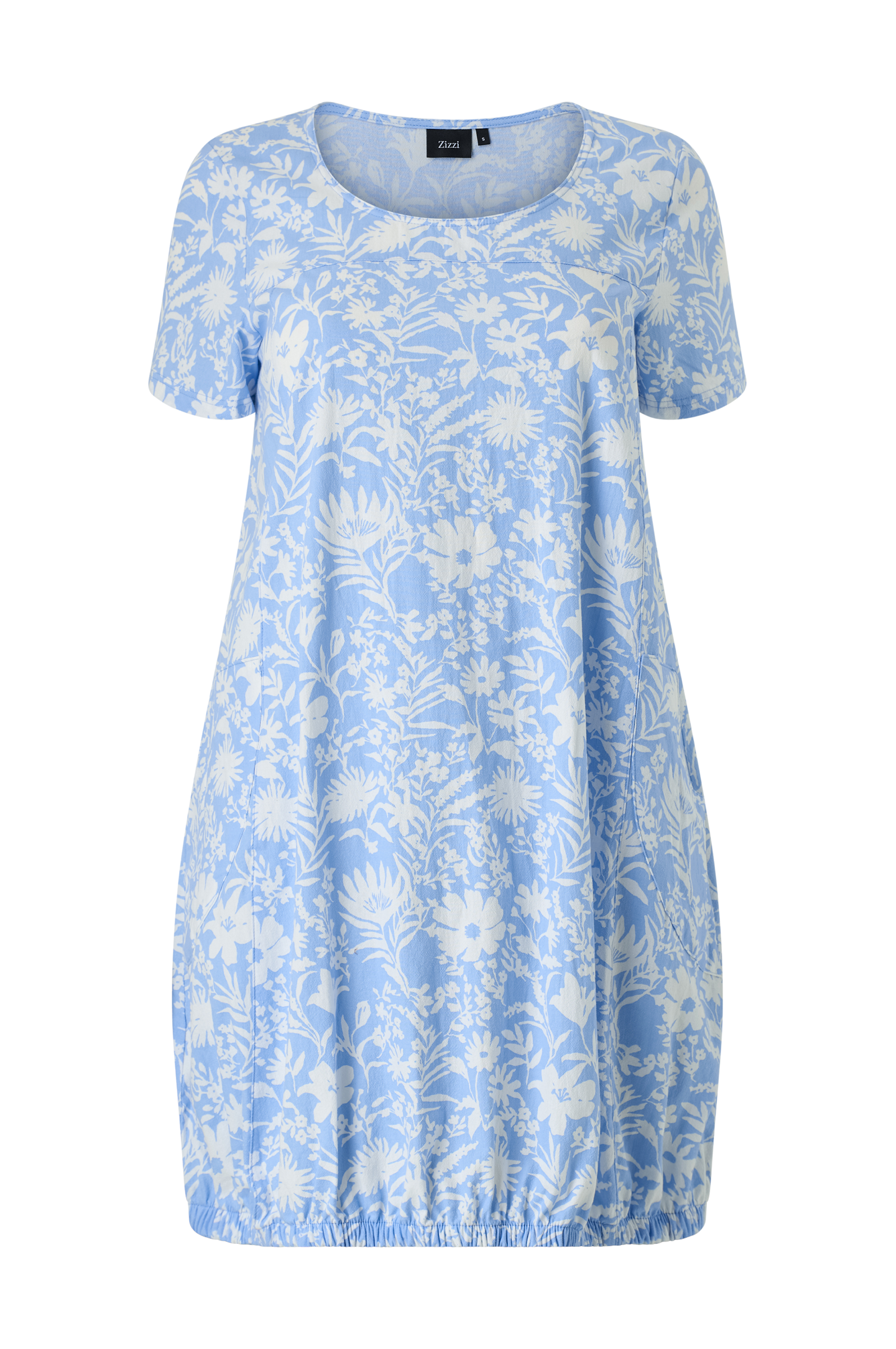 Kortærmet kjole i vævet bomuldskvalitet med mønster. Lommer foran og elastisk kant forneden. Længde ca. 95 cm i str. S.