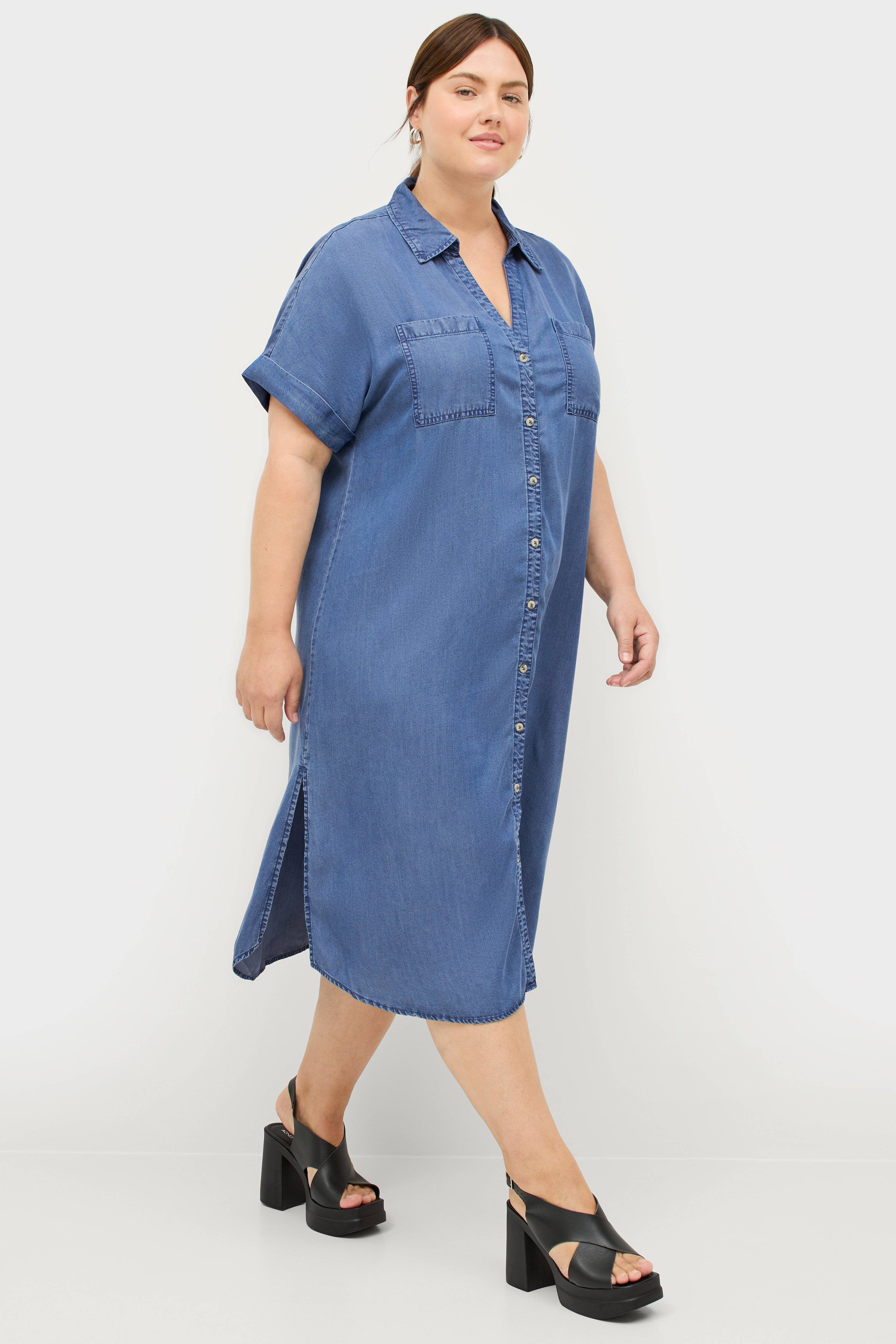 • Skjortekjole i lyocell• Gennemknappet model• Løs pasform• Korte ærmer med oprullet• To brystlommer• Slidser nede i siderne• Store størrelser• Længde: 122 cm i størrelse S