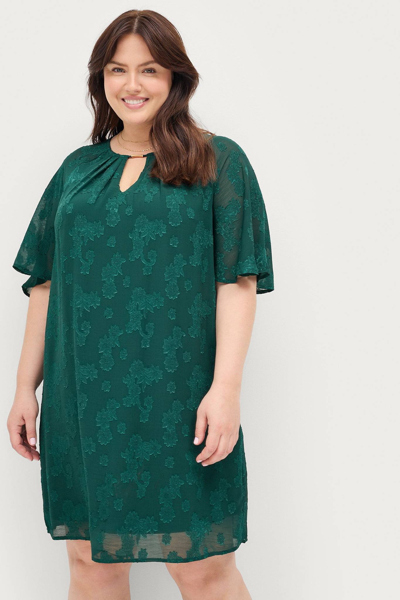 • Kjole i chiffon med jacquardmønster• Halvlange trompetærmer• Bølgeformet halsudskæring med åbning og guldfarvet detalje foran• Ventilation med knap i nakken• Trikotfor• Store størrelser• Længde: 98 cm i størrelse S