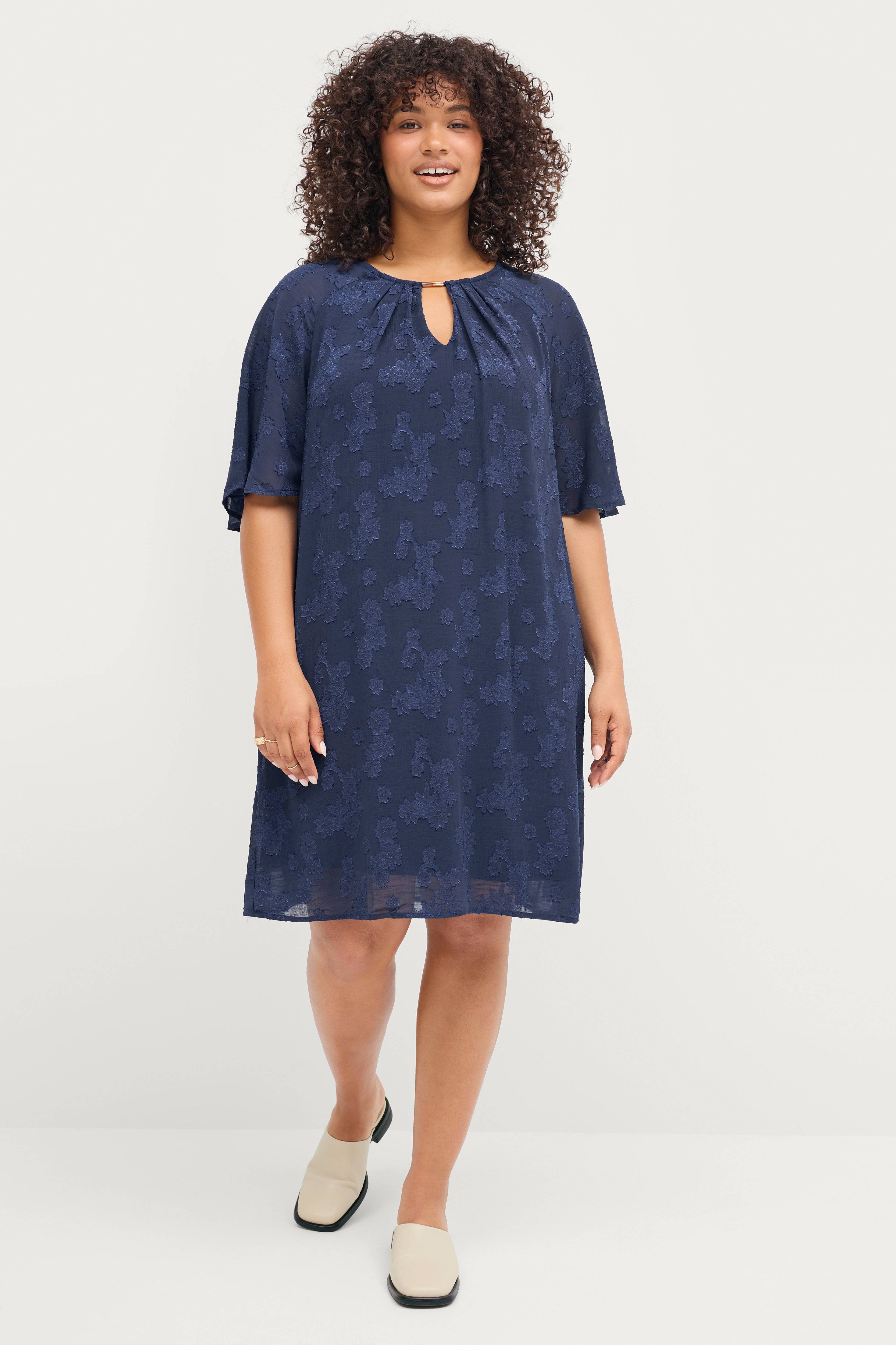 • Kjole i chiffon med jacquardmønster• Halvlange trompetærmer• Bølgeformet halsudskæring med åbning og guldfarvet detalje foran• Ventilation med knap i nakken• Trikotfor• Store størrelser• Længde: 98 cm i størrelse S