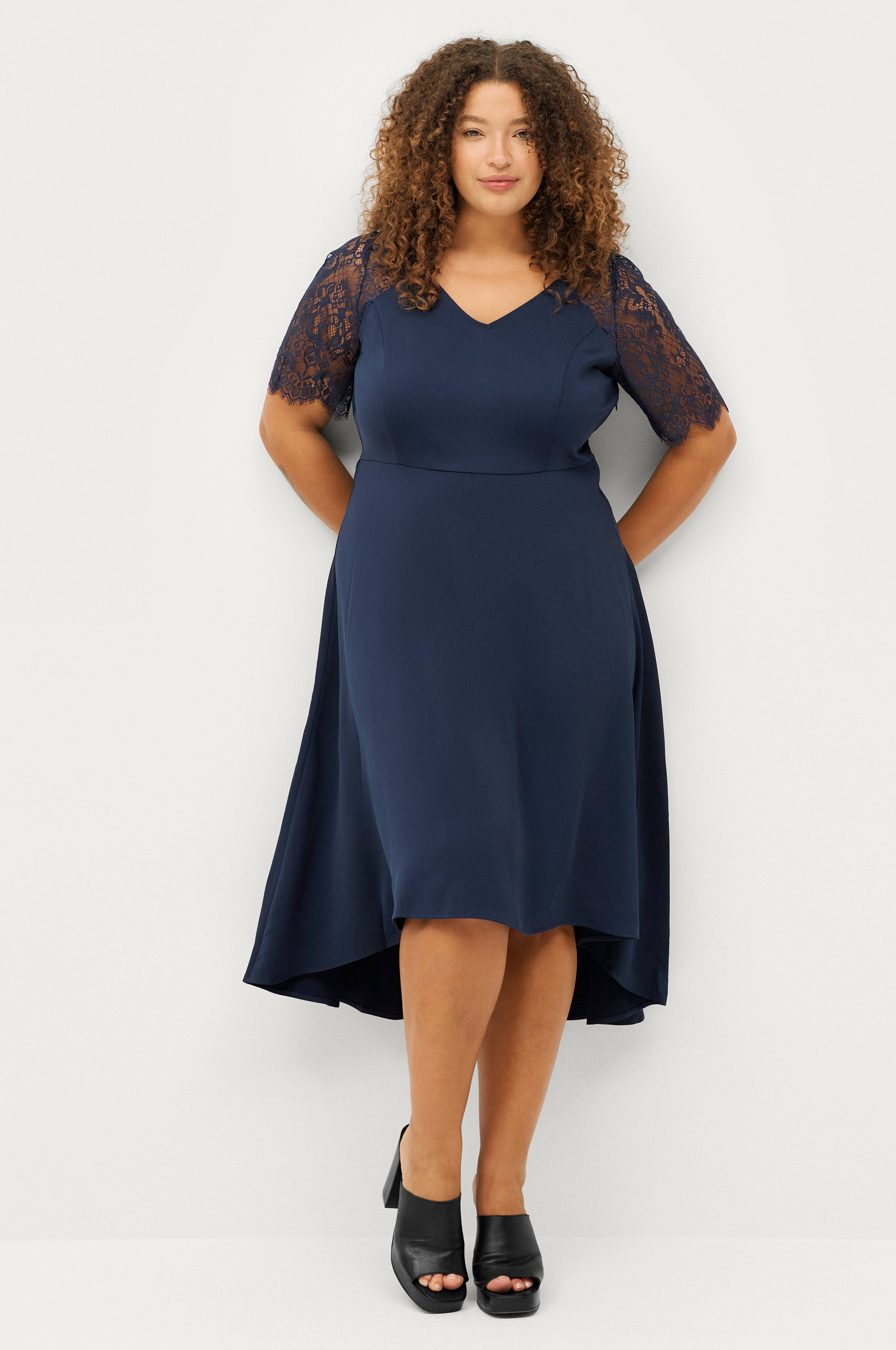 • Løs pasform • Korte ærmer i blonde • V-formet halsudskæring • Skjult lynlås i siden • Klokkeformede bukser • Store størrelser • Længde: 126 cm i størrelse S