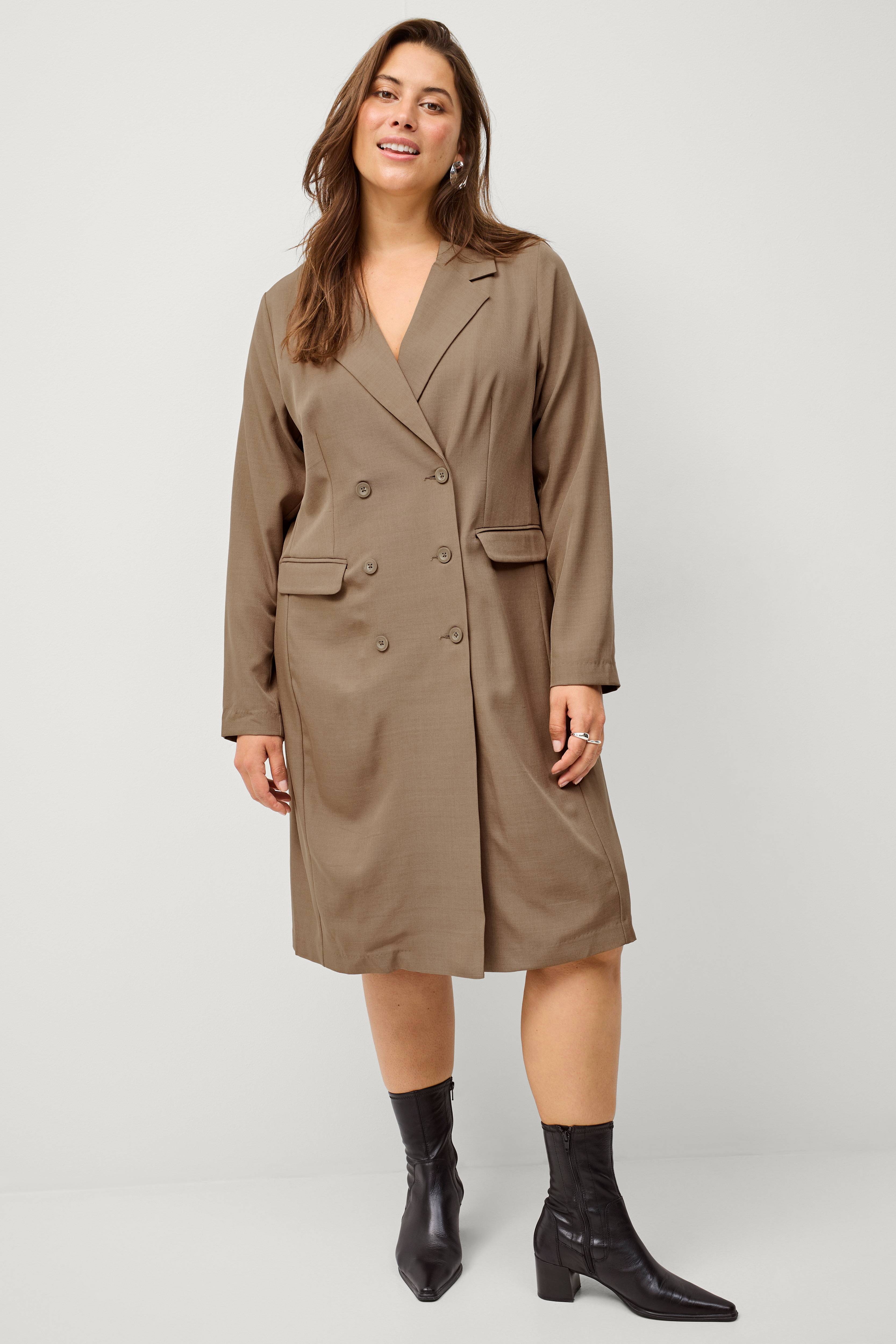• Store størrelser • Jakke-model med stor krave og revers • Dobbelt knaplukning • Paspolerede lommer med låg • Langt ærme • Længde: 106 cm i størrelse S