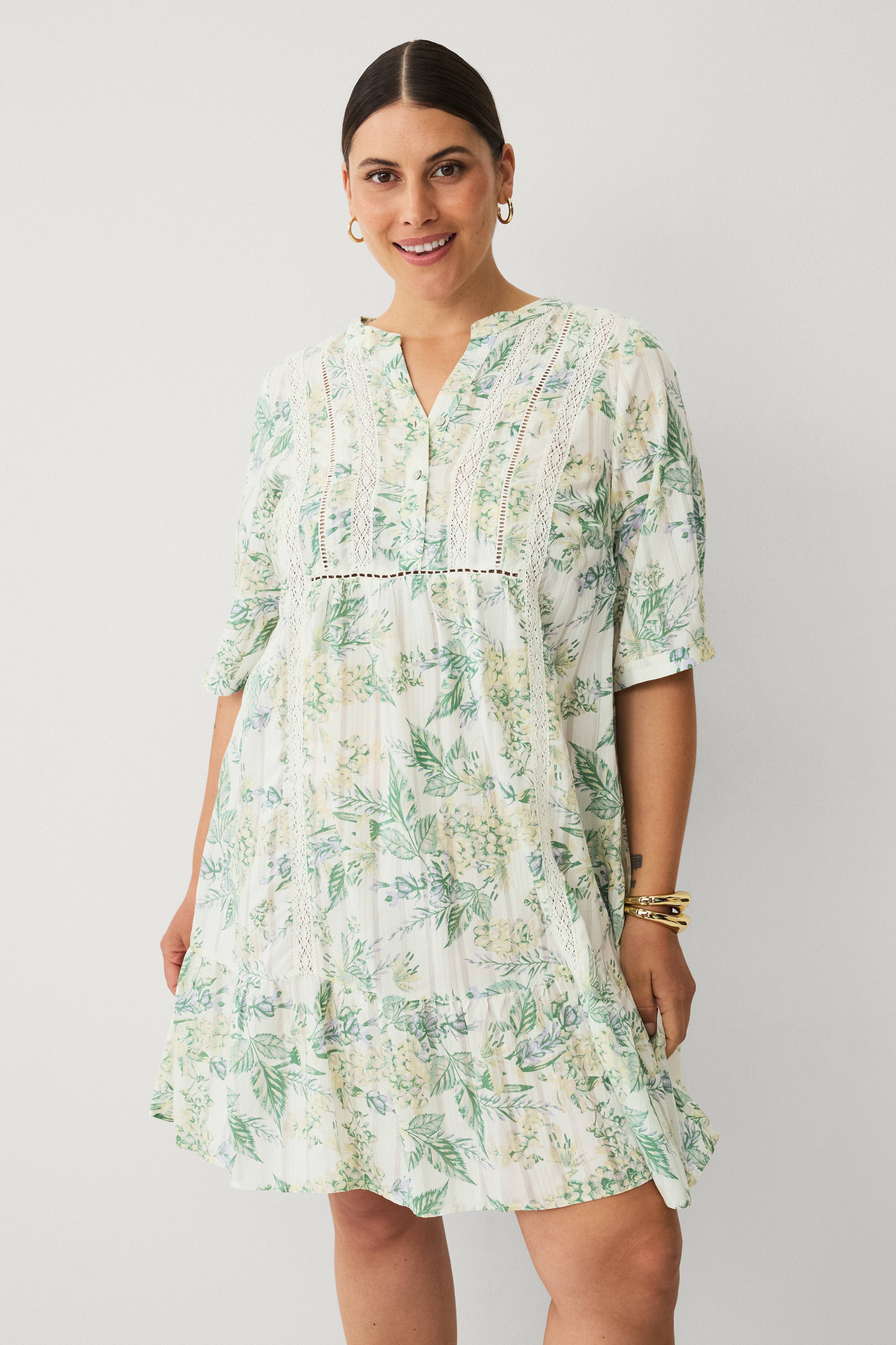 • Mønstret kjole med blondedetaljer foran • Løs, a-linjeformet model med volant nederst • Rund halsudskæring med slids og knaplukning • Halvlange ærmer • Store størrelser • Længde: 95 cm i størrelse S