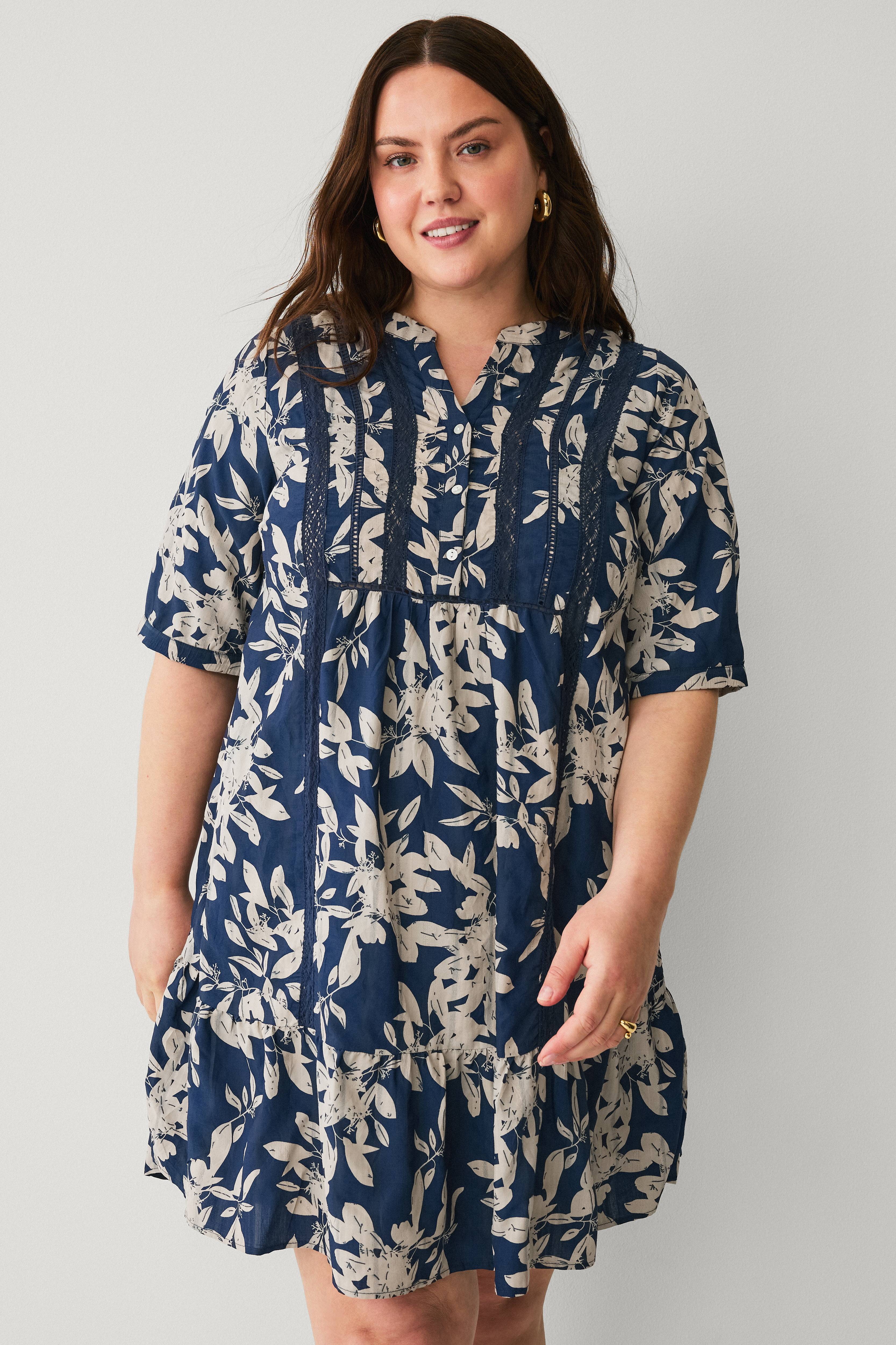 • Mønstret kjole med blondedetaljer foran • Løs, a-linjeformet model med volant nederst • Rund halsudskæring med slids og knaplukning • Halvlange ærmer • Store størrelser • Længde: 95 cm i størrelse S