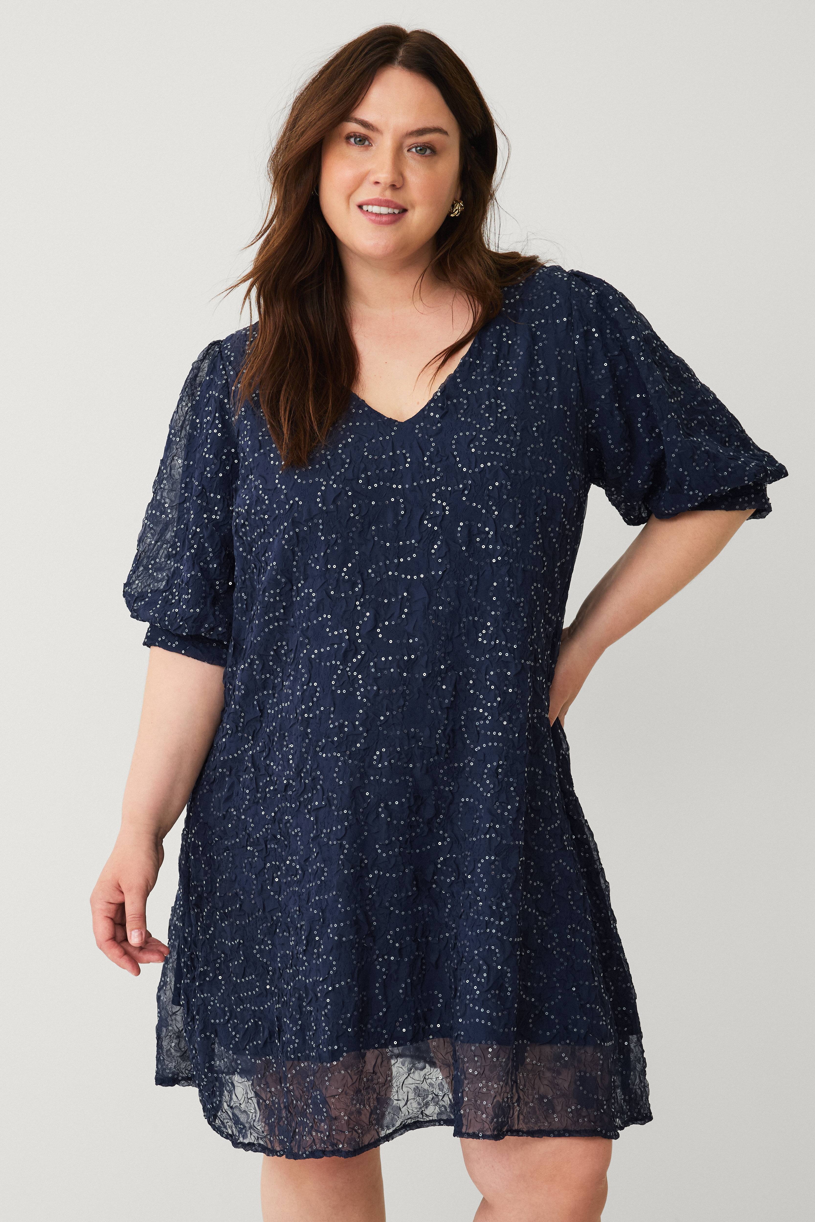 • Kort kjole med pailleter• V-udskæring• 2/4 længdee pufærmer• Manchet ved manchetterne• Tekstilforing• Normal pasform• Store størrelser• Længde: 100 cm i størrelse S