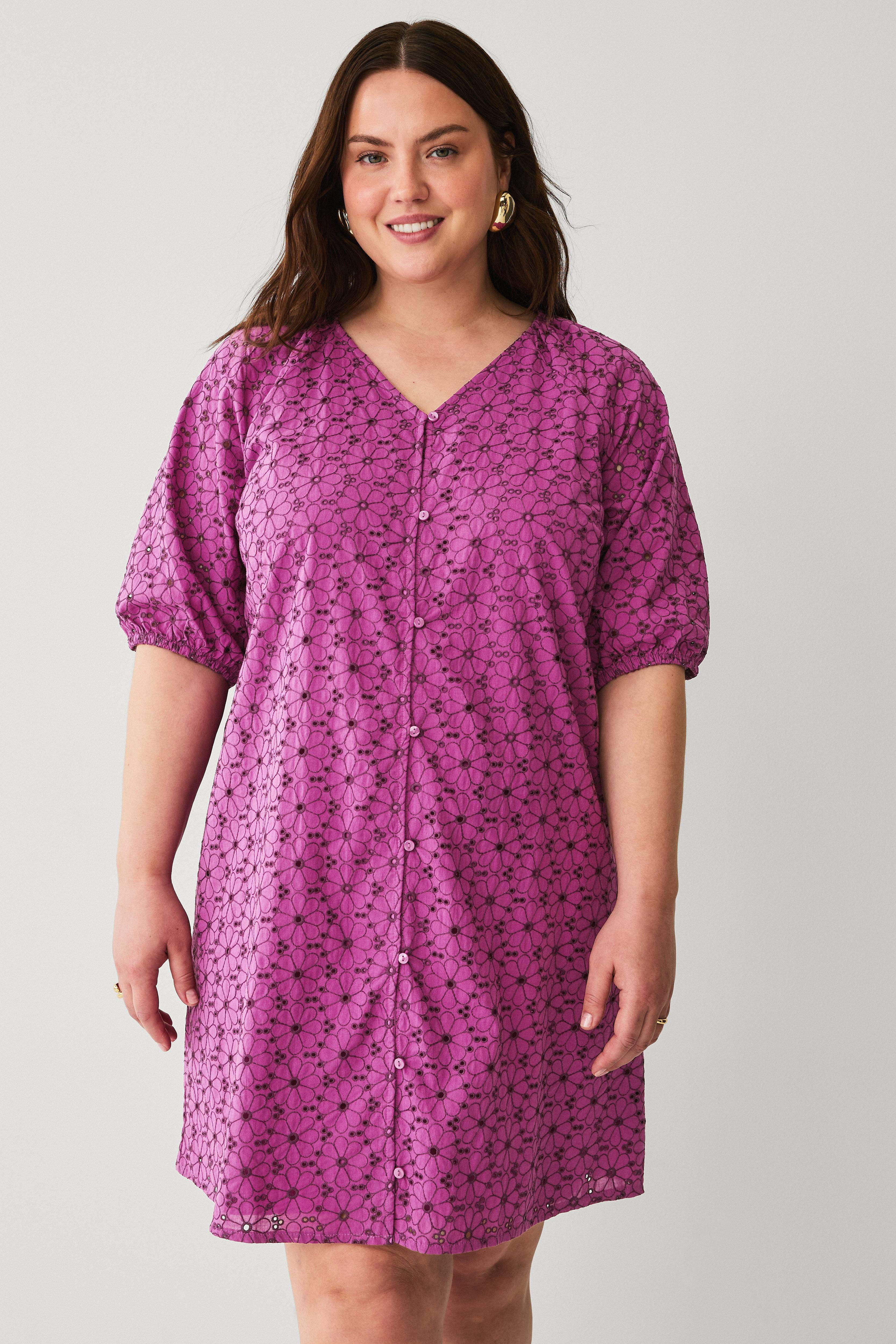 • Kjole med broderet blomstermønster• V-formet halsudskæring• Halvlange ærmer med elastiske ærmeafslutninger• Knapper foran• For i blød viskose• Stor størrelse• Længde: 95 cm i størrelse S