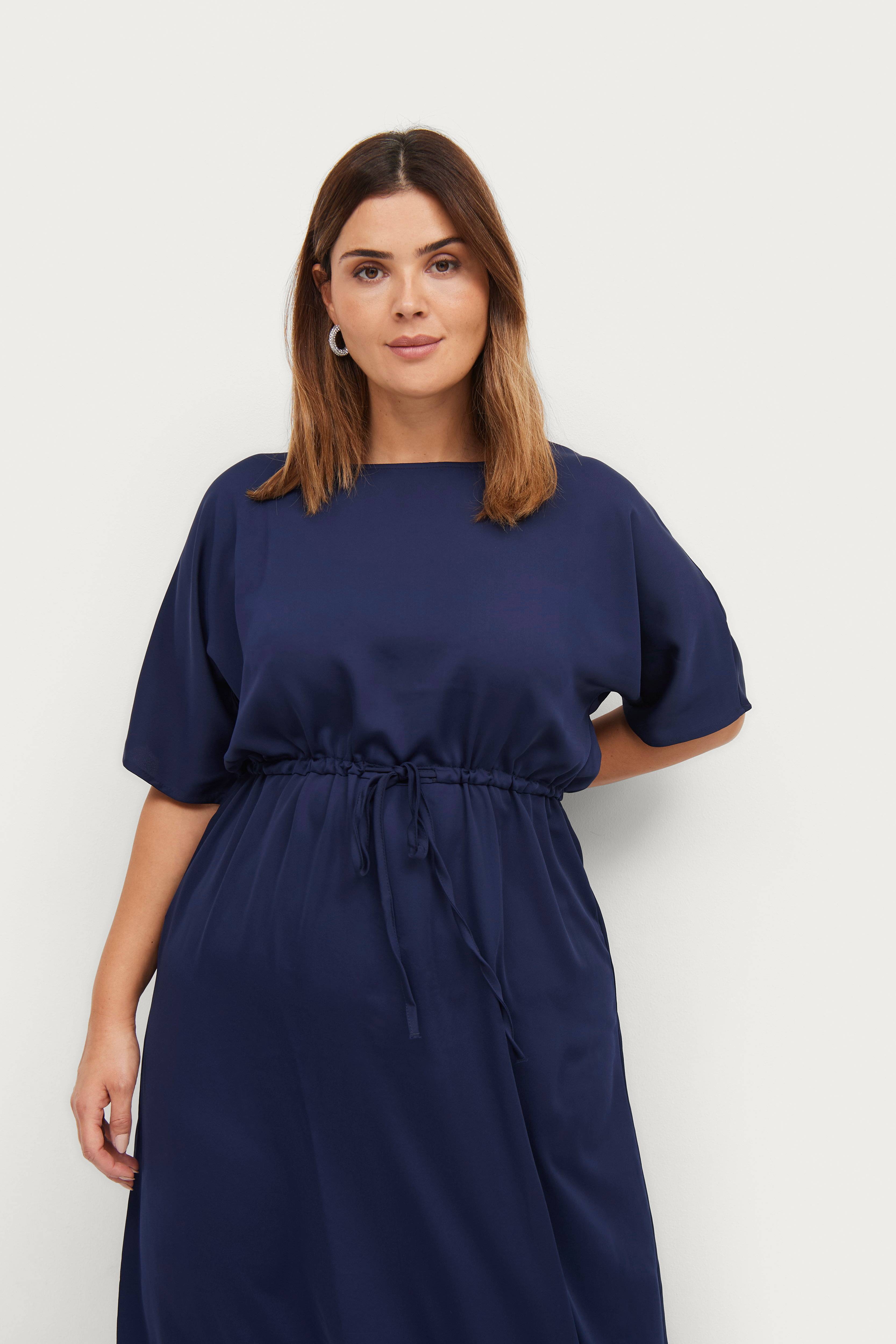 • Løs pasform• Rund halsudskæring• Kort ærme• Træksnørre ved taljen• Store størrelser• Længde: 129 cm i størrelse S