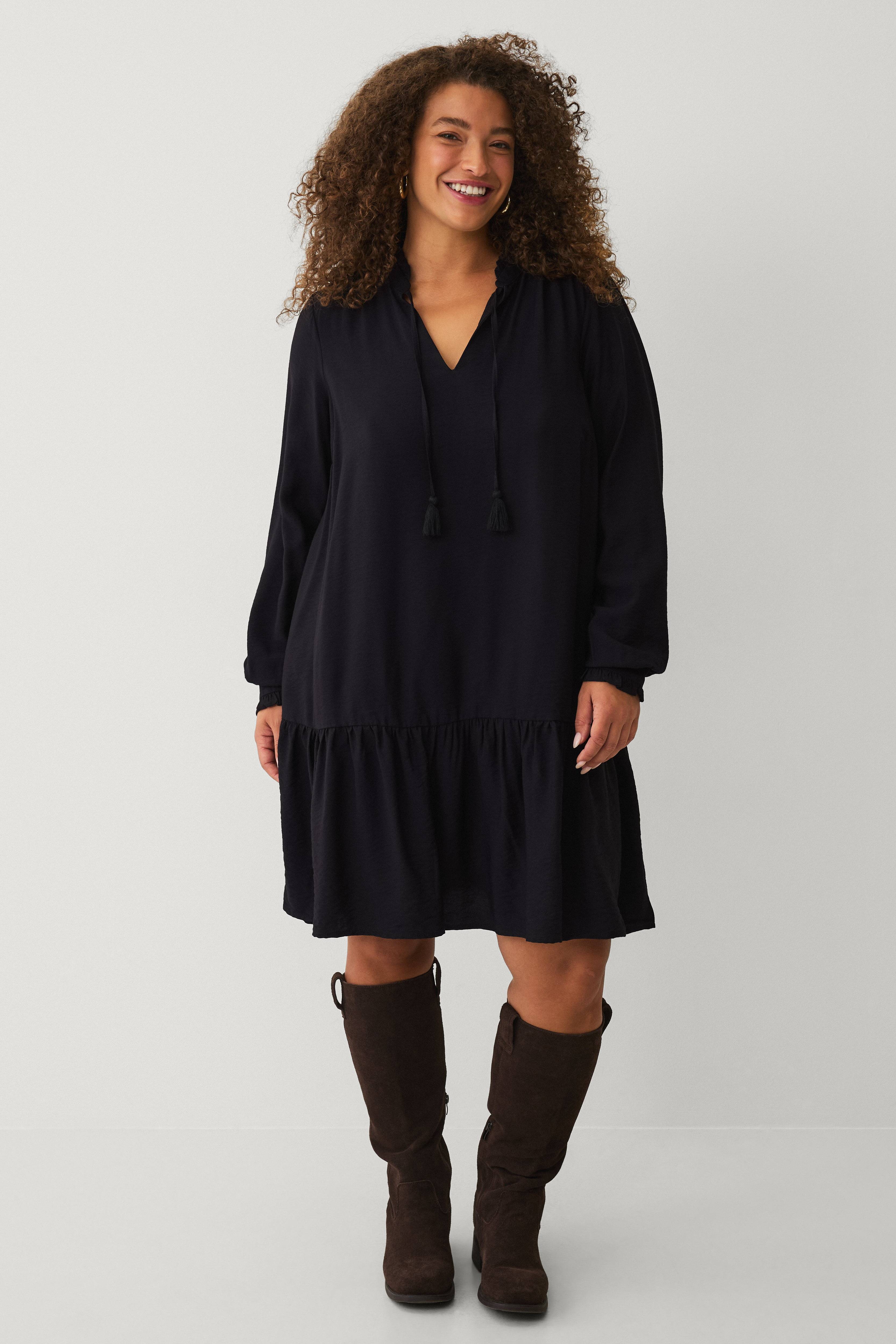 • Kjole i viskose• V-formet halsudskæring med flæsekant på toppen• Bindebånd med kvaster på halsen• Samling på skuldrene• Lange ærmer med manchet og volant ved manchetterne• Volant nederst• Længde: 99 cm i størrelse S• Plusstørrelser