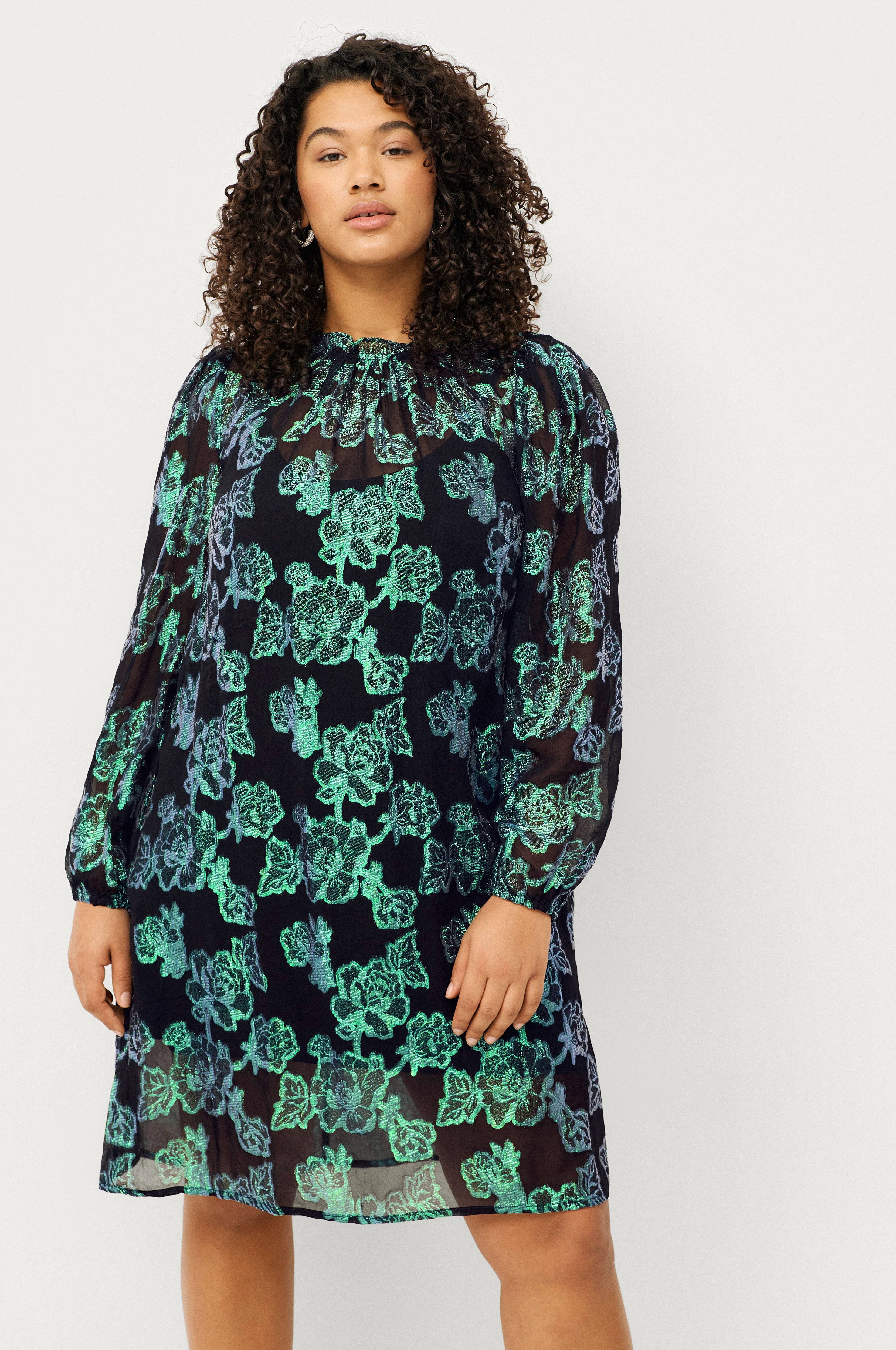 • Fremstillet af transparent viskose med skinnende lurexmateriale• Rund halsudskæring med flæsekant• Slids med knap i nakken• Lange ærmer med elastisk bånd ved manchetterne• Store størrelser• Længde: 101 cm i størrelse S