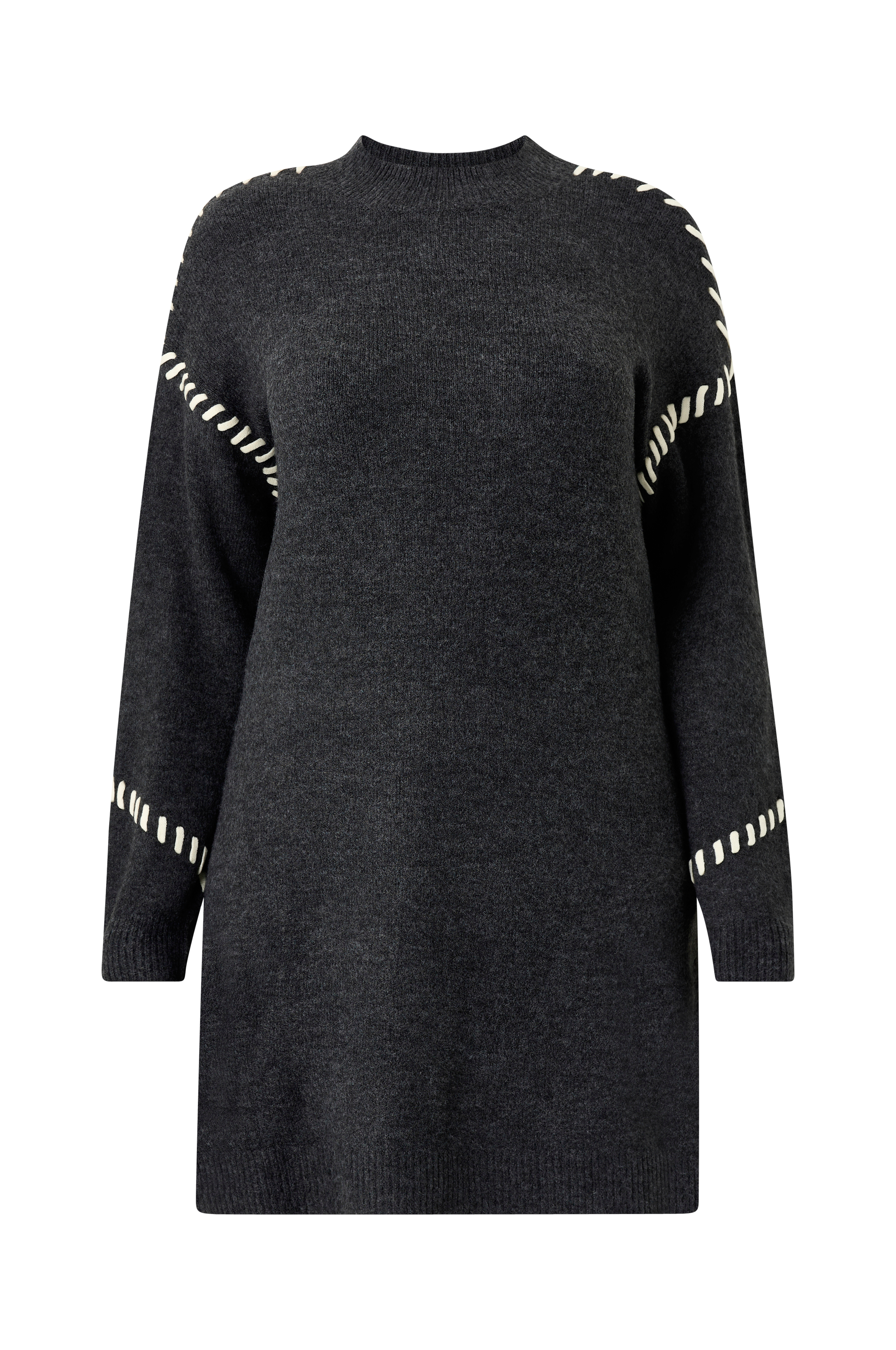 • Blød, strikket kjole• Rund, ribbet halsudskæring• Dekorative, kontrastfarvede syninger• Ribmanchet ved manchetterne• Ribstrik ved nederste kant• Længde: 99 cm i størrelse S• Plusstørrelser