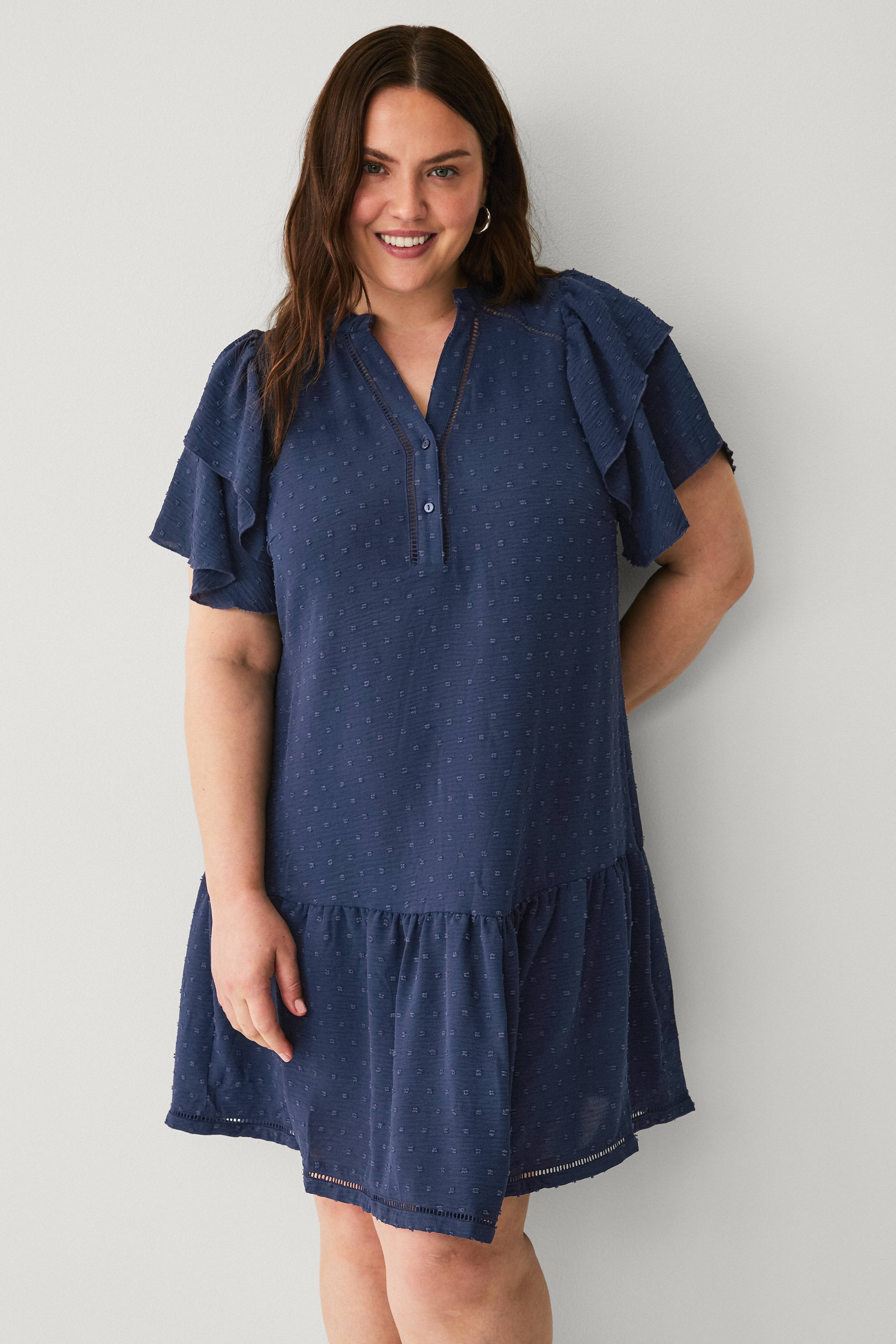 • Knælang kjole med prikket struktur• V-formet halsudskæring med kort knaplukning foran• Korte flæseærmer• Blondekant ved brystet og Sømme• Volant nederst• Stor størrelse• Længde: 95 cm i størrelse S