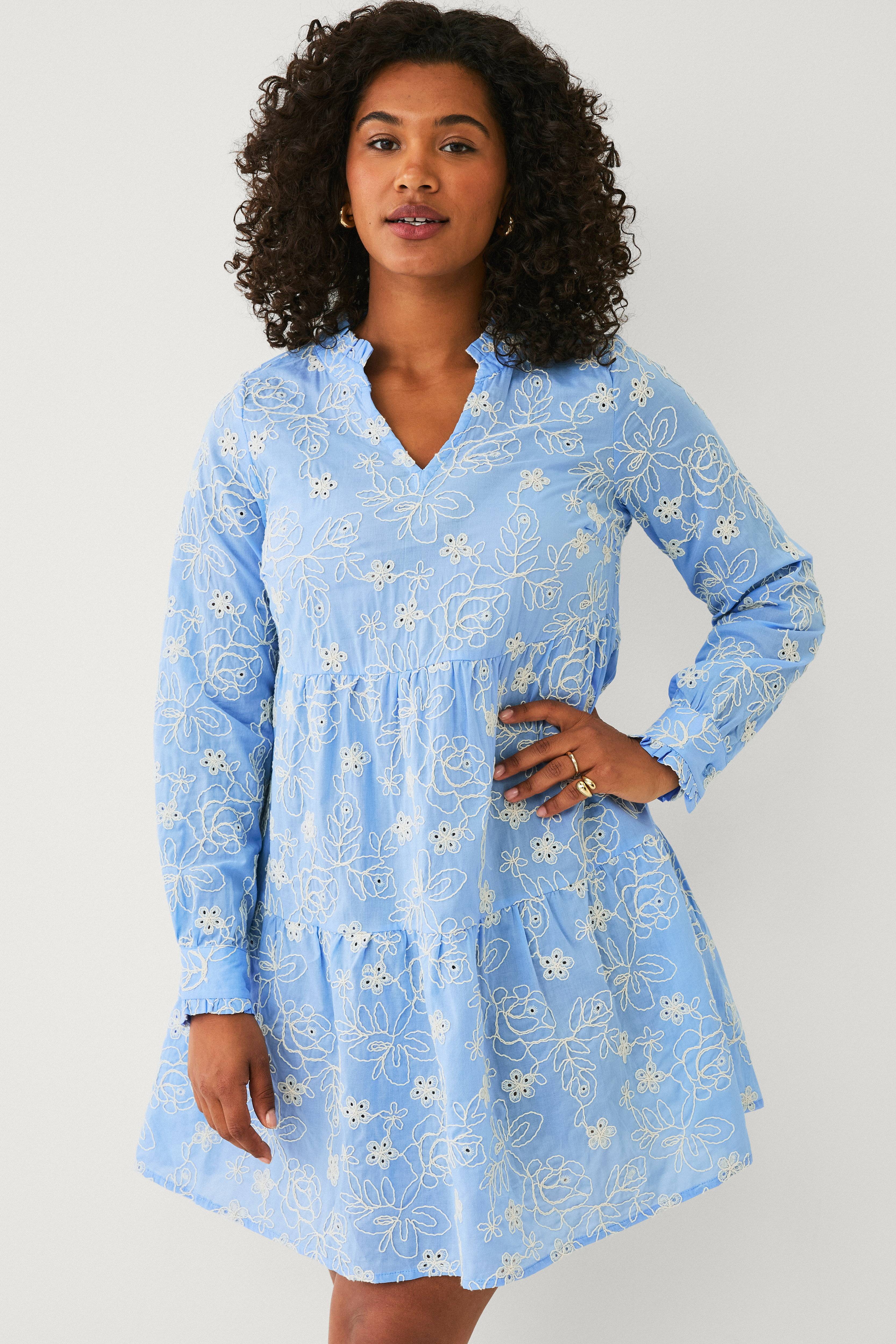 • A-linjeformet kjole i bomuld• Løs pasform• V-formet halsudskæring med flæsekant hele vejen rundt• Broderede blomster• Lange ærmer• Rynkede ærmeafslutninger med knap• Store størrelser• Længde: 91 cm i størrelse XS