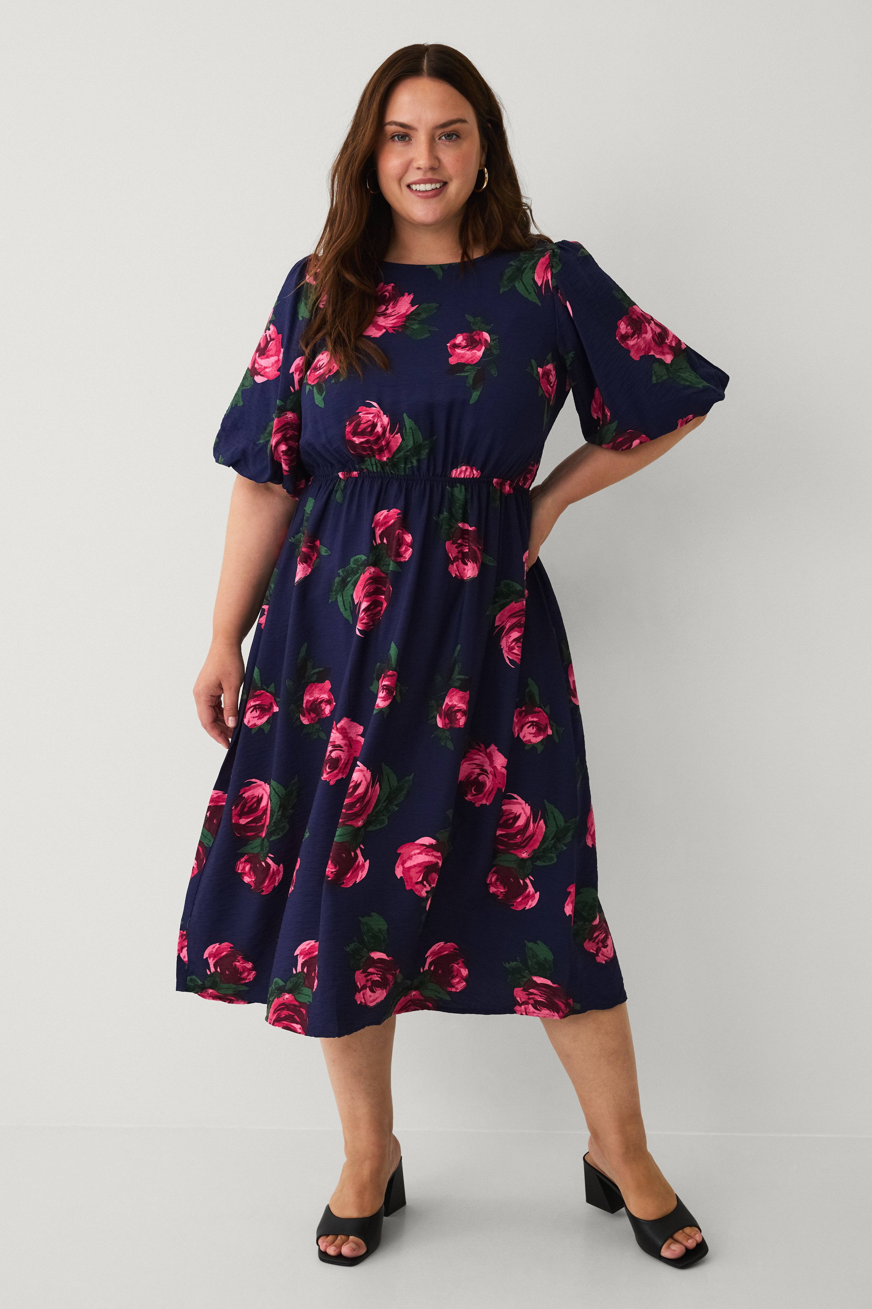 • Midikjole med et blomstermønster og korte ballonærmer• Rund halsudskæring med nøglehulsåbning og bindebånd i nakken• Elastik ved taljen• Plusstørrelser• Længde: 123 cm i størrelse S