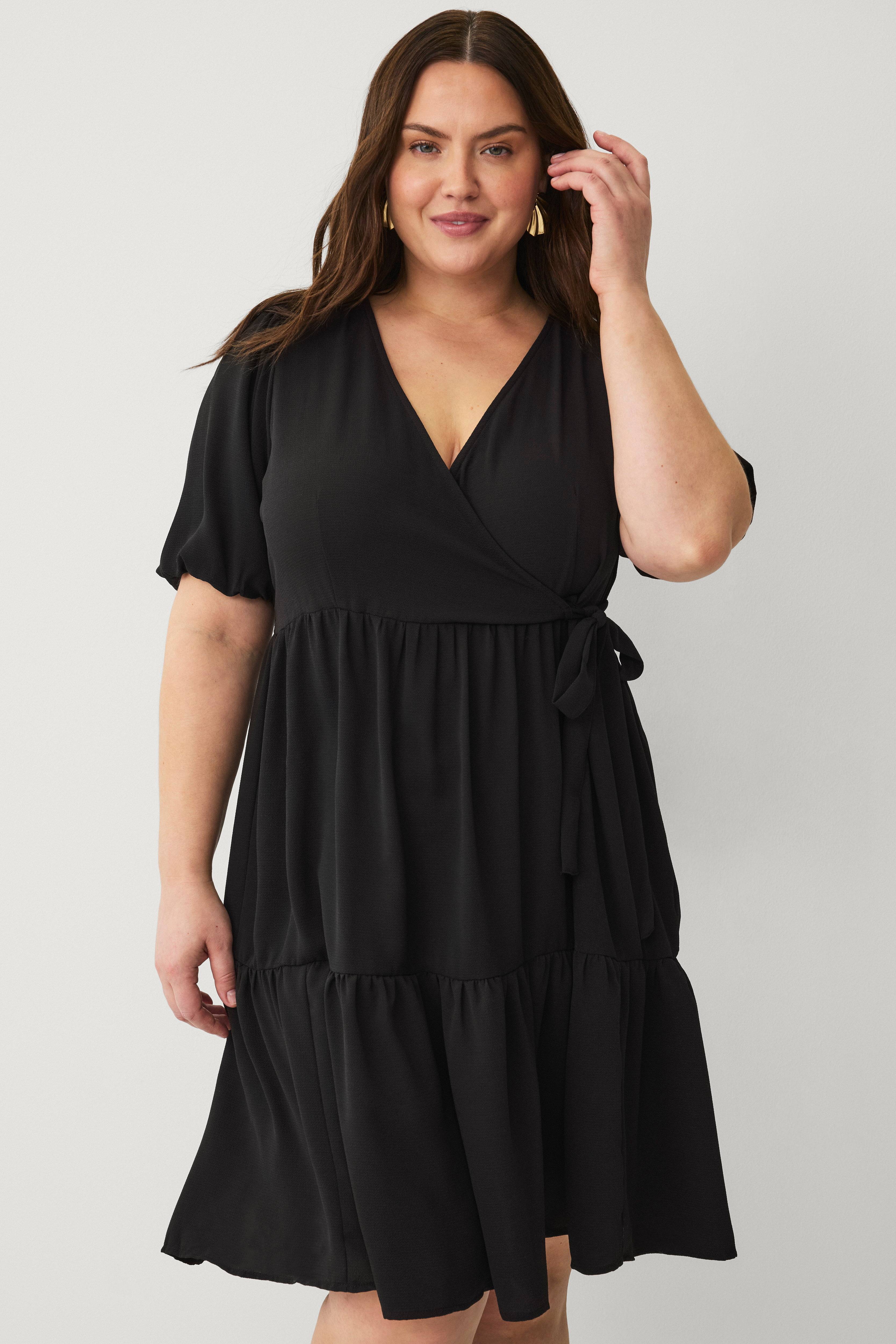 • Kjole i tynd, luftig polyester med struktur• Korte pufærmer med elastik ved manchetterne• Slå-om design med bindebånd ved brystet• Design med volanter på den nederste del• Store størrelser• V-ringning• Længde: 101 cm i størrelse S