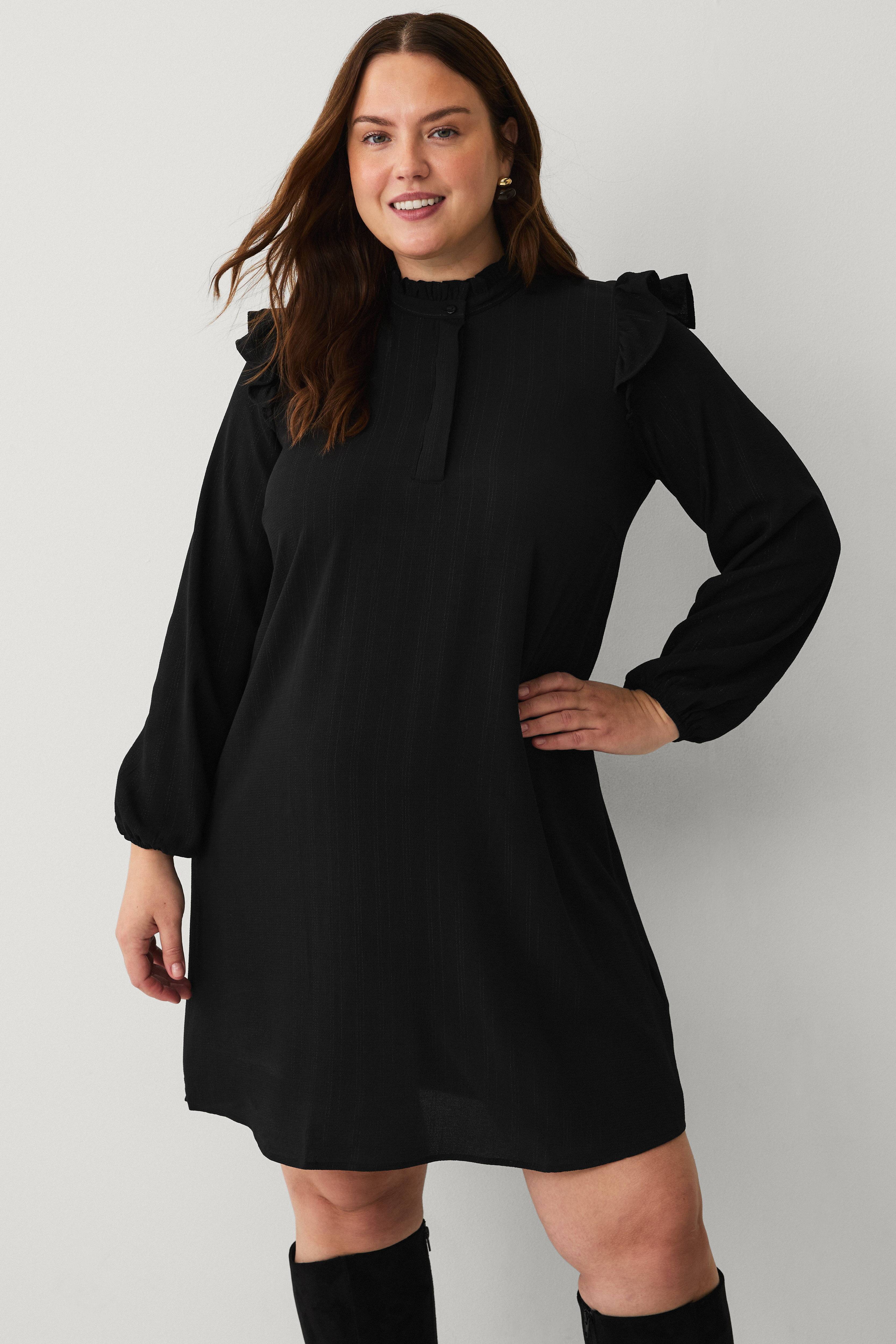 • Kjole med glitrende, tynde striber• Rund halsudskæring med skjult knapstolpe• Volantdetaljer rundt om halsen og omkring skuldrene• Langt ærme med elastik ved manchetterne• Store størrelser• Længde: 95 cm i størrelse S