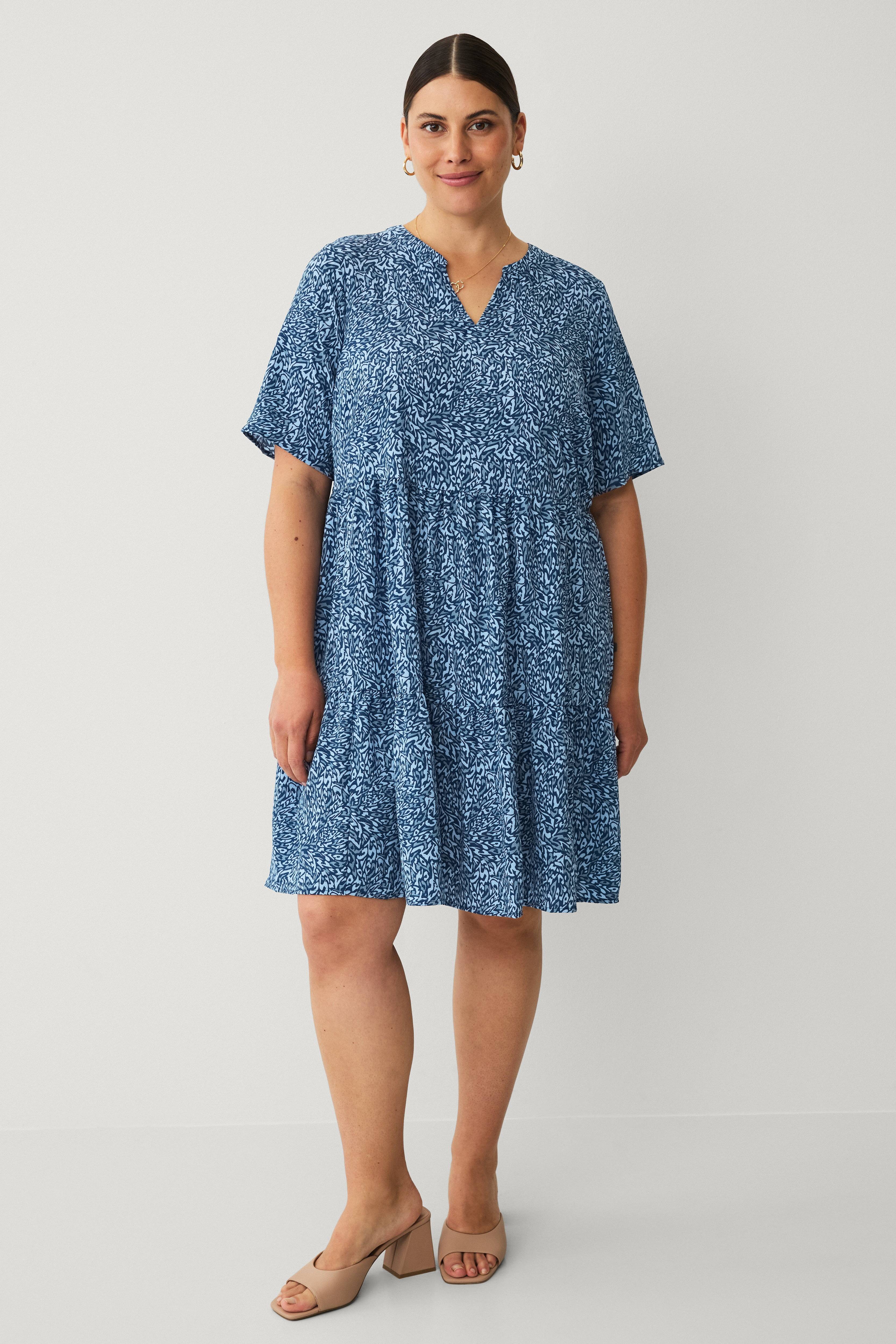 • Model med svaj• V-udskæring• Korte ærmer• Kreppet kvalitet• Store størrelser• Længde: 96 cm i størrelse S