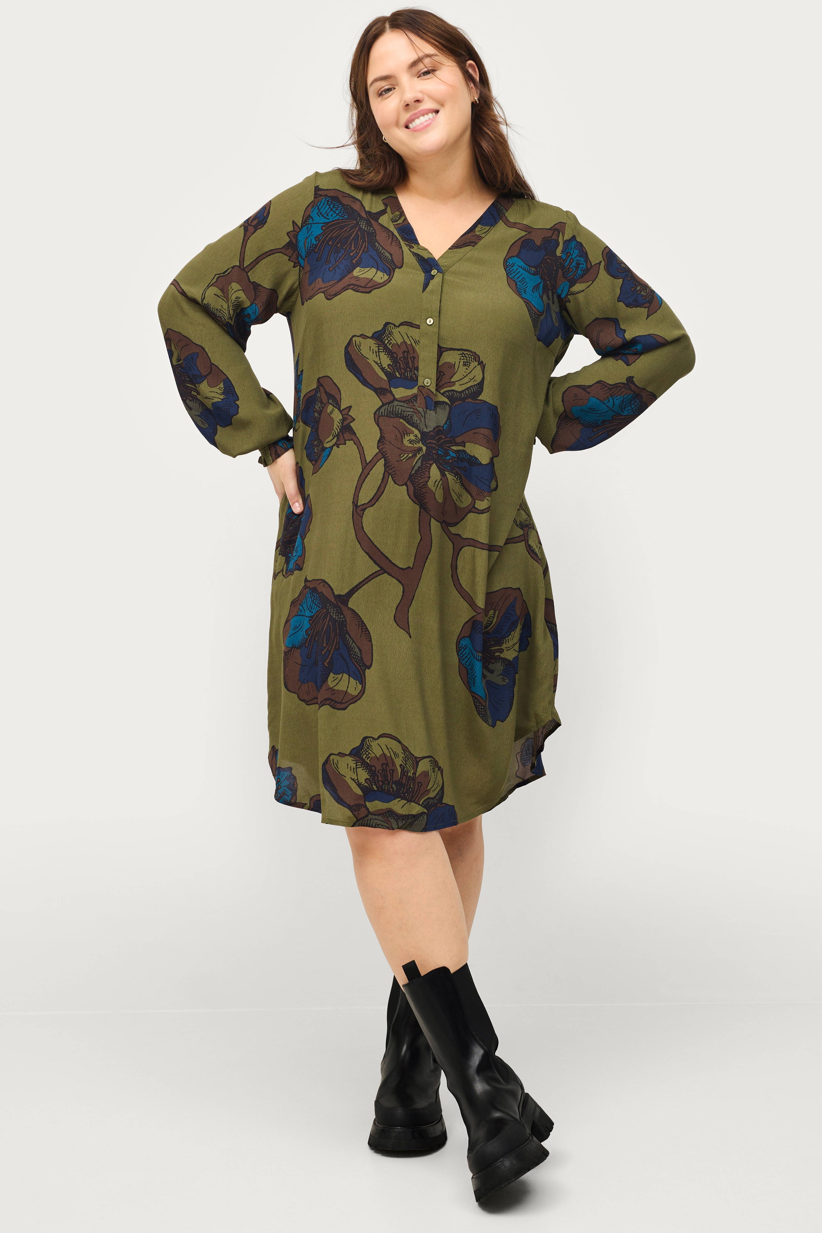 • Mønstret kjole i viskose• V-udskæring med knapper foran• Smock ved manchetterne• Store størrelser• Længde: 104 cm i størrelse S