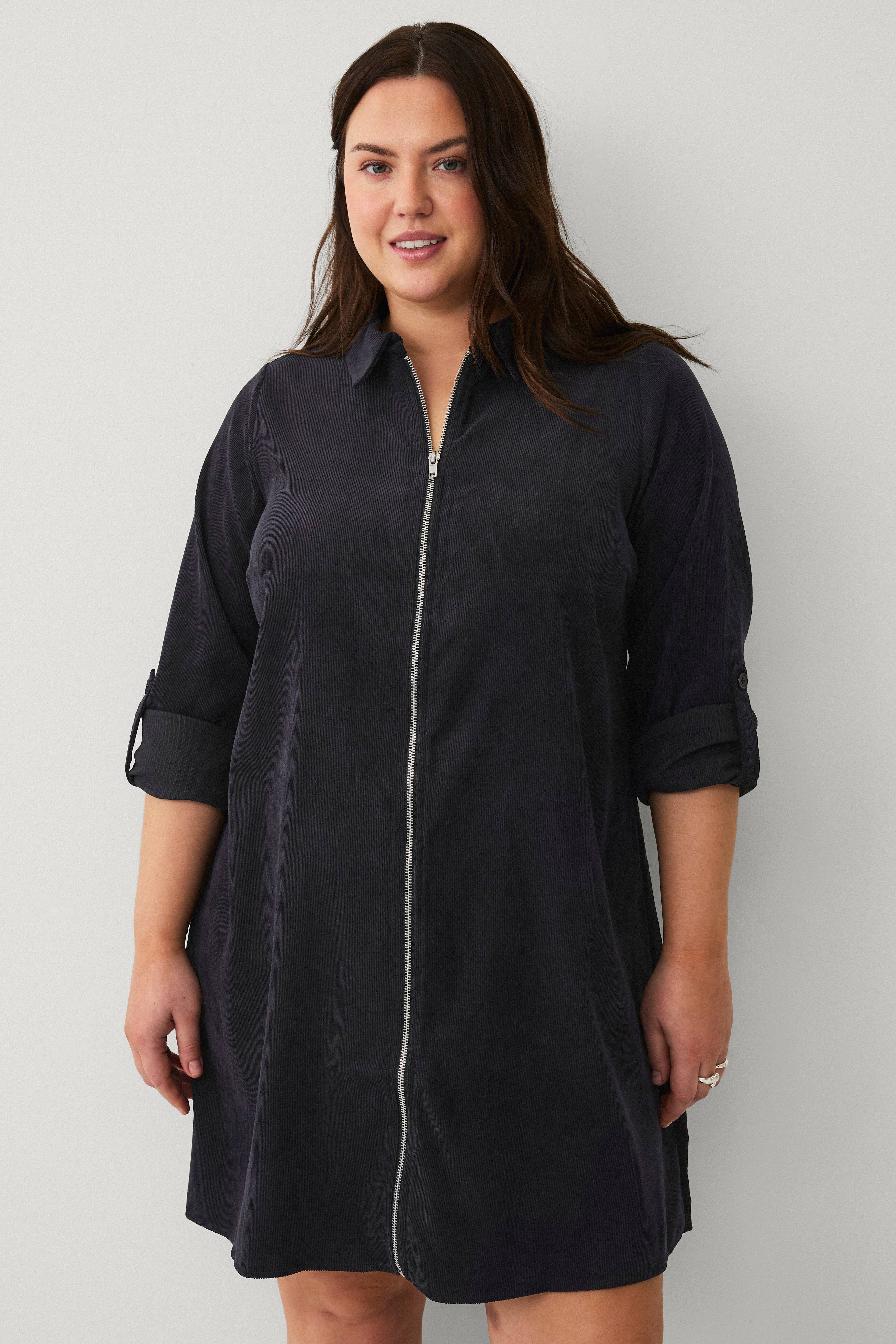 • Kjole i kraftig fløjl• Løst A-linje design• Krave• Fuld længde lynlås• Opfoldende, 3/4 lange ærmer med knap ved manchetterne• Store størrelser• Længde: 93 cm i størrelse S