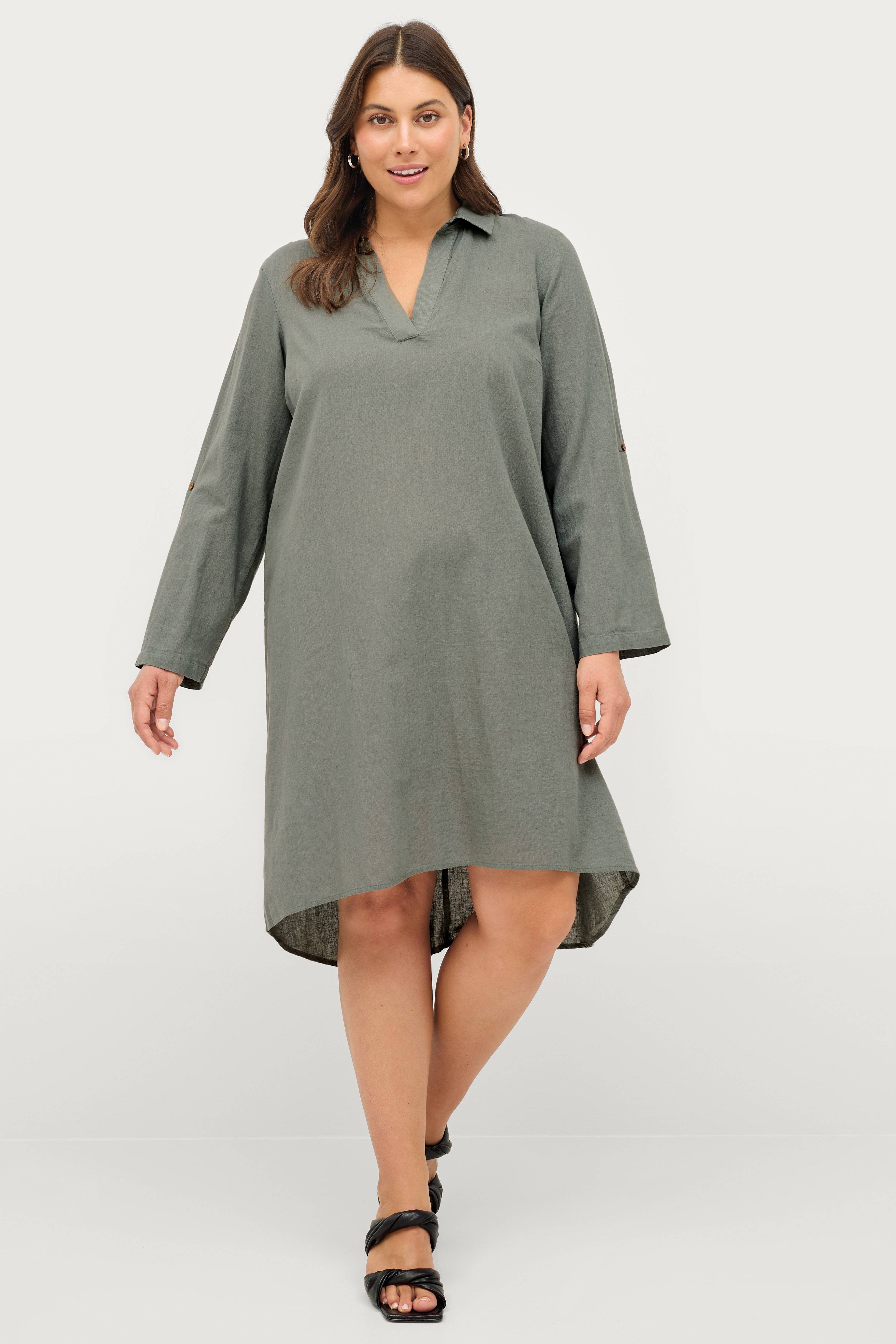 • Store størrelser• Kjole i hørblanding• V-udskæring med krave• Langt ærme med knap til oprulning• Længere bagpå• Længde: 107 cm i størrelse S