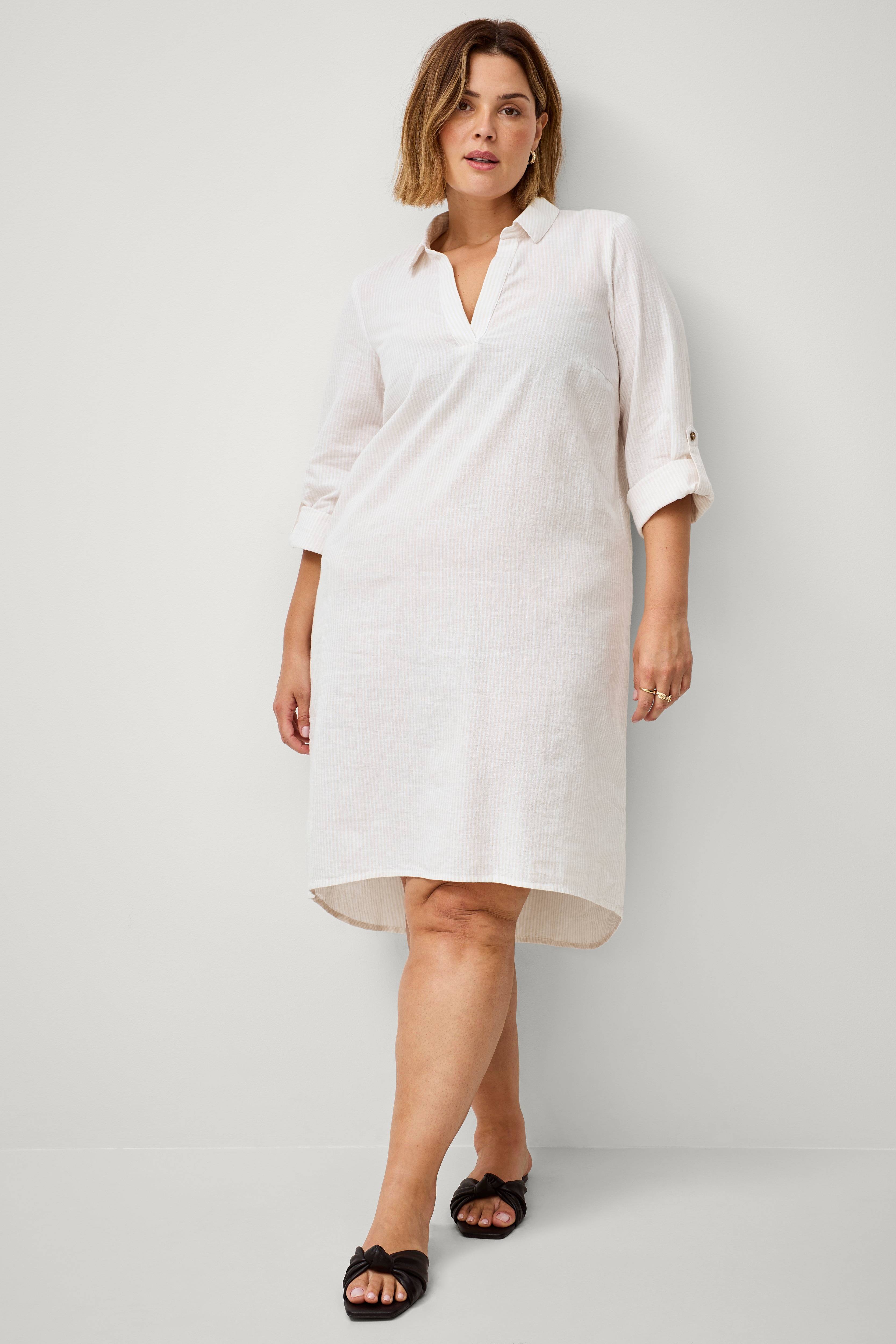 • Store størrelser• Kjole i hørblanding• V-udskæring med krave• Langt ærme med knap til oprulning• Længere bagpå• Længde: 107 cm i størrelse S