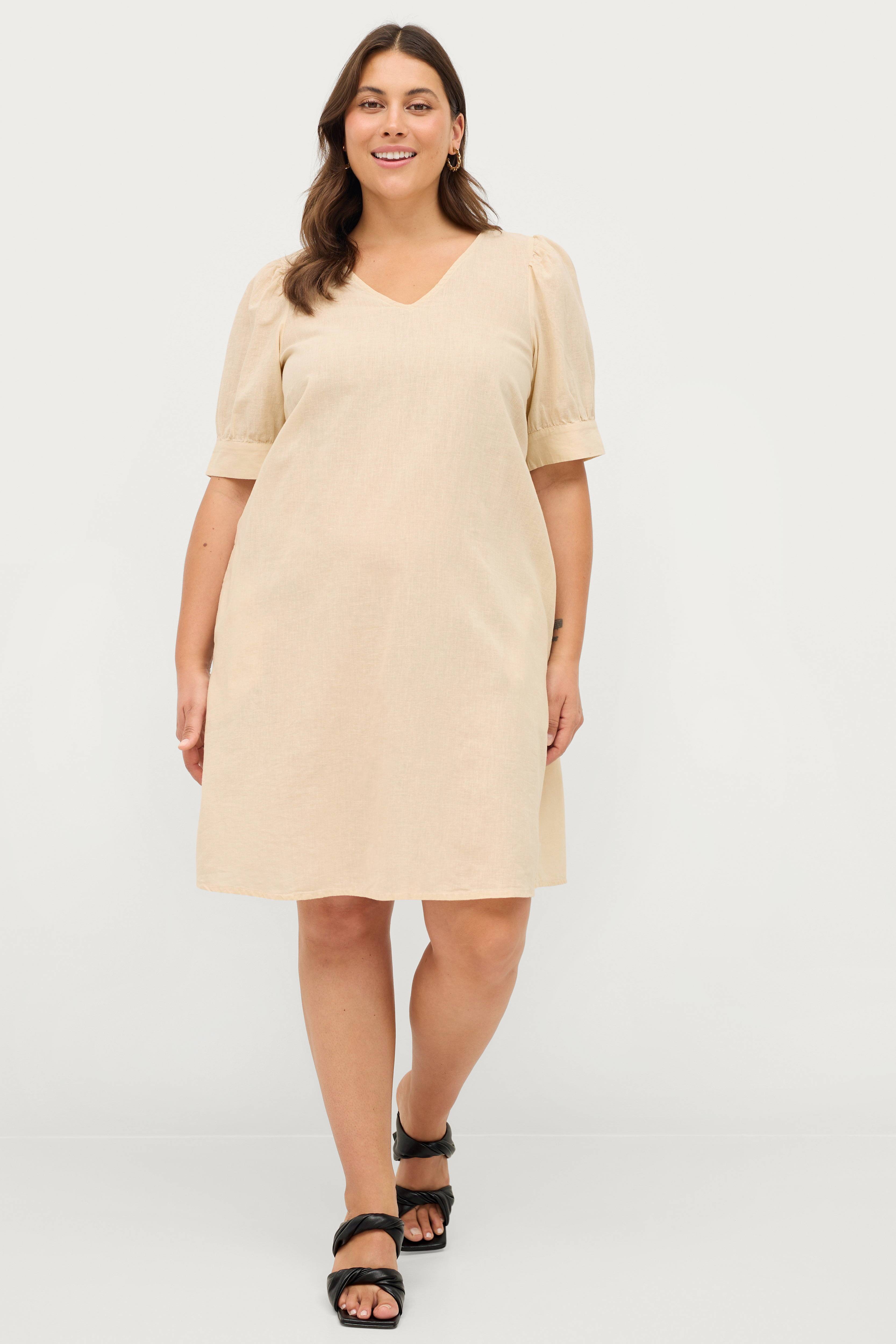 • Kjole i hørblanding• V-udskæring• Korte ballonærmer• Lommer i siderne• Store størrelser• Længde: 98 cm i størrelse 98