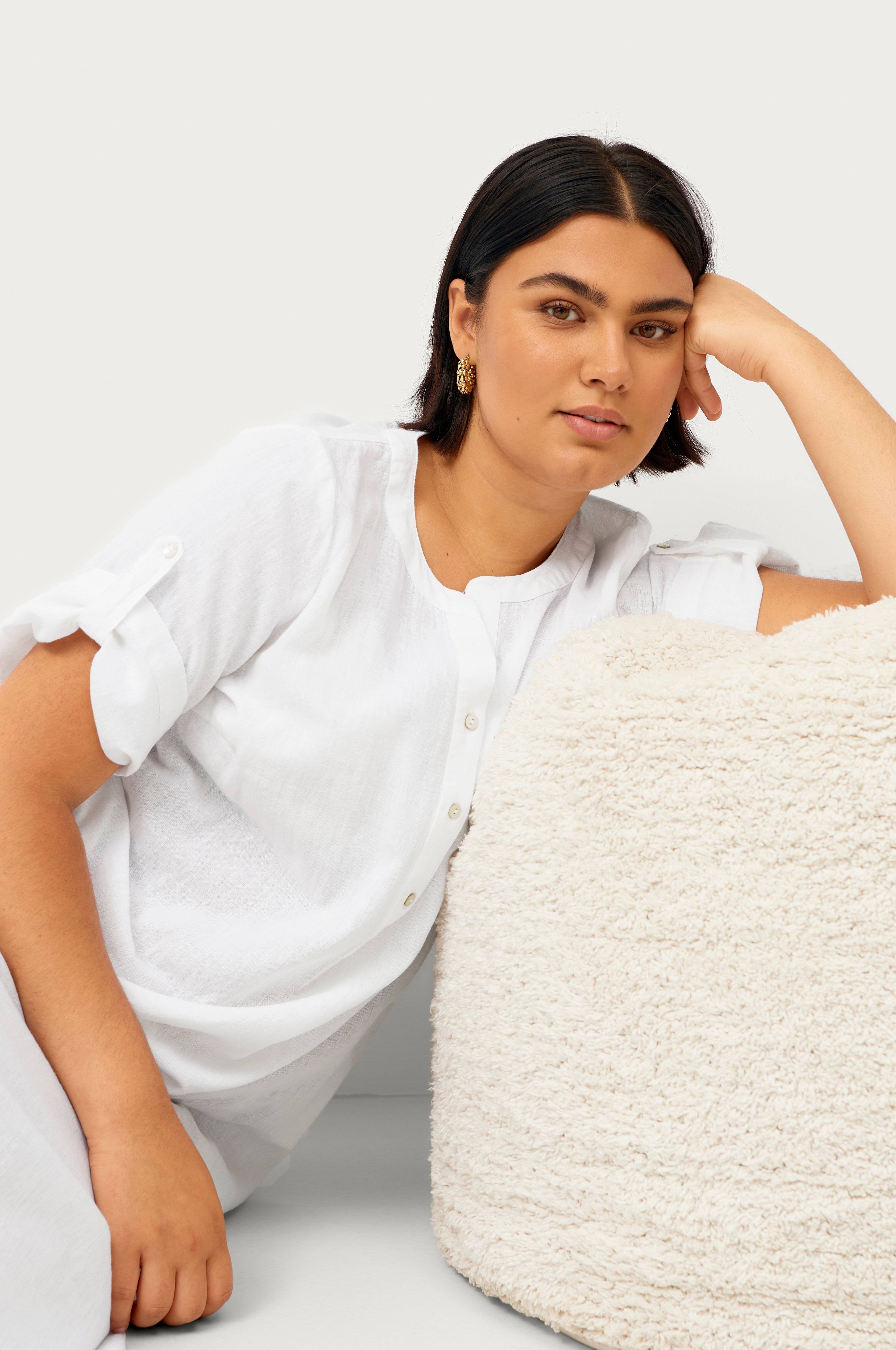 • Store størrelser• Kjole i hørblanding• Knapper oppe foran• Halvlange ærmer med knap til oprulning• Knapper i siderne• Slidser nede i siderne• Længde: 118 cm i størrelse S