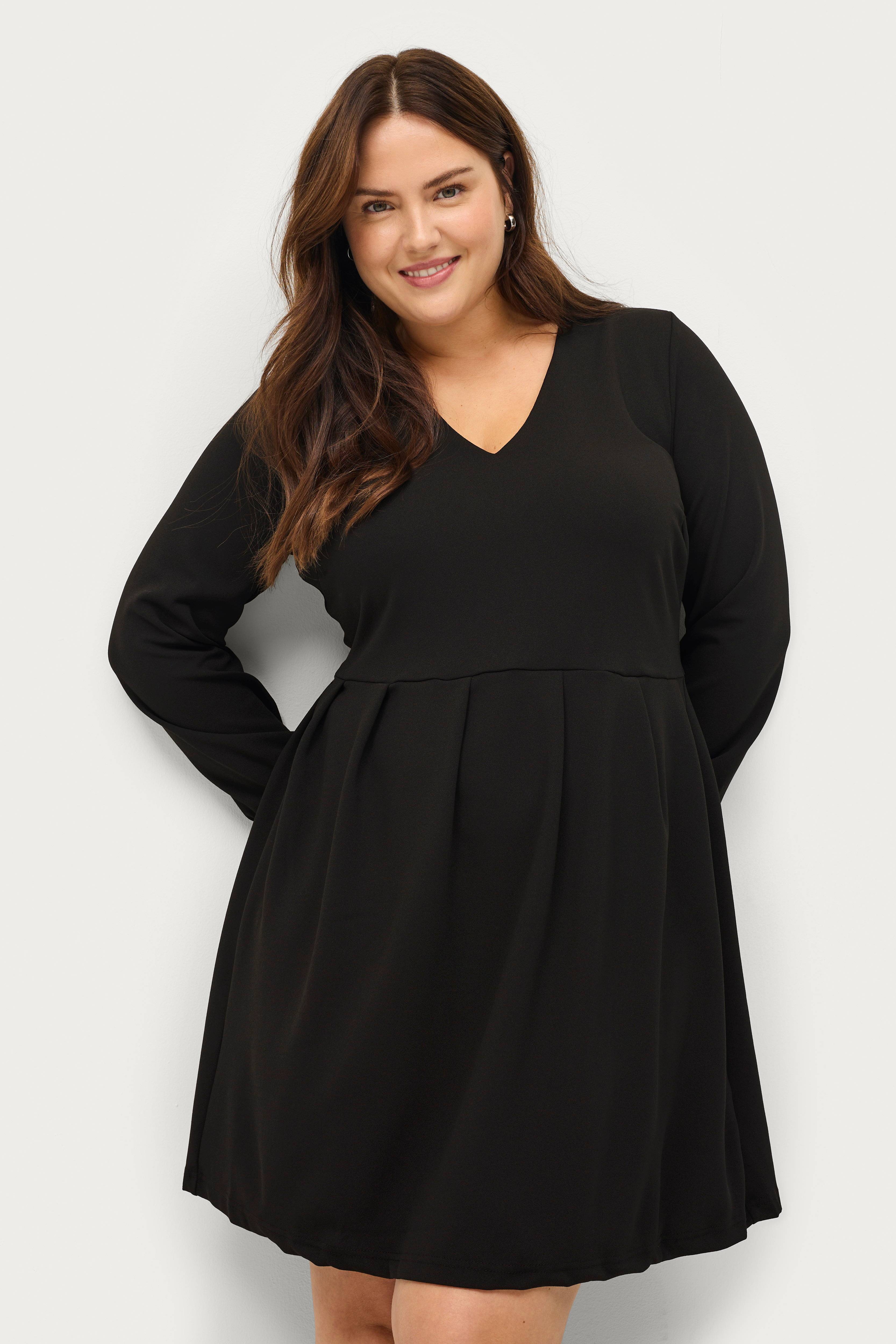 • V-udskæring• Lægge ved taljen• Manchet ved manchetterne• Strækkvalitet• Store størrelser• Længde: 95 cm i størrelse S